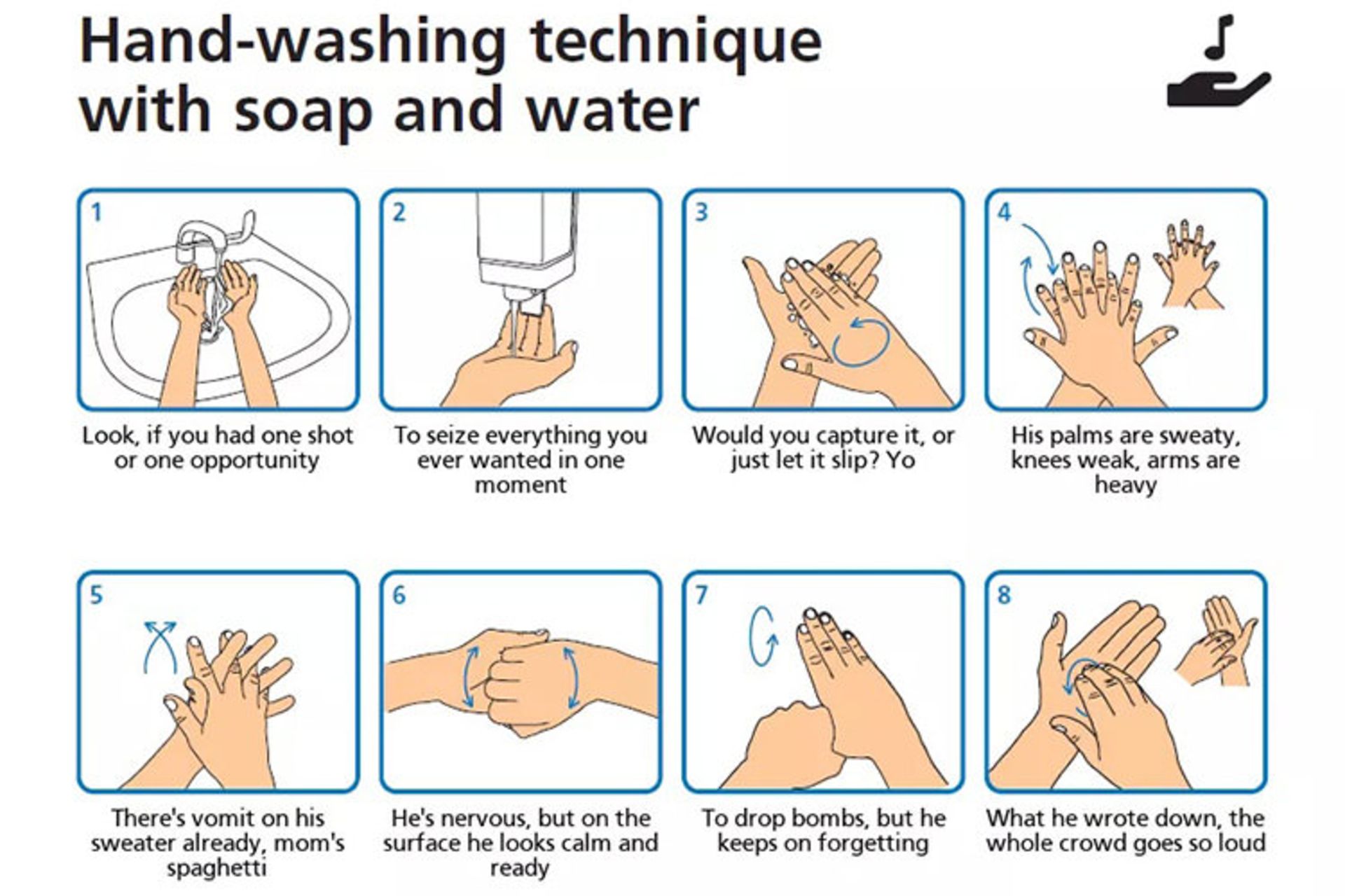ابزاری که در قالب وبسایت در دسترس قرار گرفته شده توسط توسعهدهندهی بریتانیایی تولید شده است که با نام کاربری William در توییتر فعالیت دارد و در عین سادگی، کاربردی است. روش انجام به این صورت است که برای تکمیل پوستر آموزش شستن دست باید نام آهنگ و خوانندهی مورد نظر خود را در باکسهای مربوطه وارد کنید تا با استفاده از متن ترانههای موجود در وبسایت Genius خط به خط اشعار را در بخشهای مختلف اینفوگرافیک دستورالعمل شستن دستها قرار دهد. برای مثال در اینفوگرافیک زیر متن شعر آهنگ «Lose Yourself» از «امینم» خوانندهی آمریکایی در تمام مراحل دستورالعمل شستوشوی صحیح دستها آمده است.