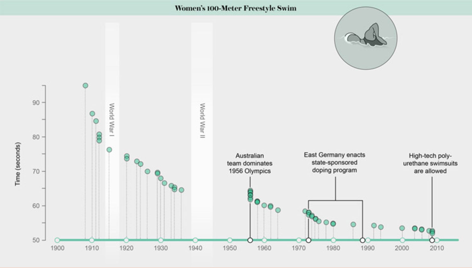 جنگ، تغییرات اجتماعی، بهبودهای تکنولوژیک و تغییر قوانین نقش بسزایی در رکوردشکنی داشته و تاثیر عوامل اشاره شده در عملکرد ورزشکاران مختلف که مرزها را درنوردیدهاند، بسیار تاثیر گذار بوده است. در نمودارهای پایین میتوانید تمام رکوردشکنیها طی مسابقات المپیکی و غیرالمپیکی را از سال ۱۹۰۰ تا ۲۰۱۶ مشاهده کنید.