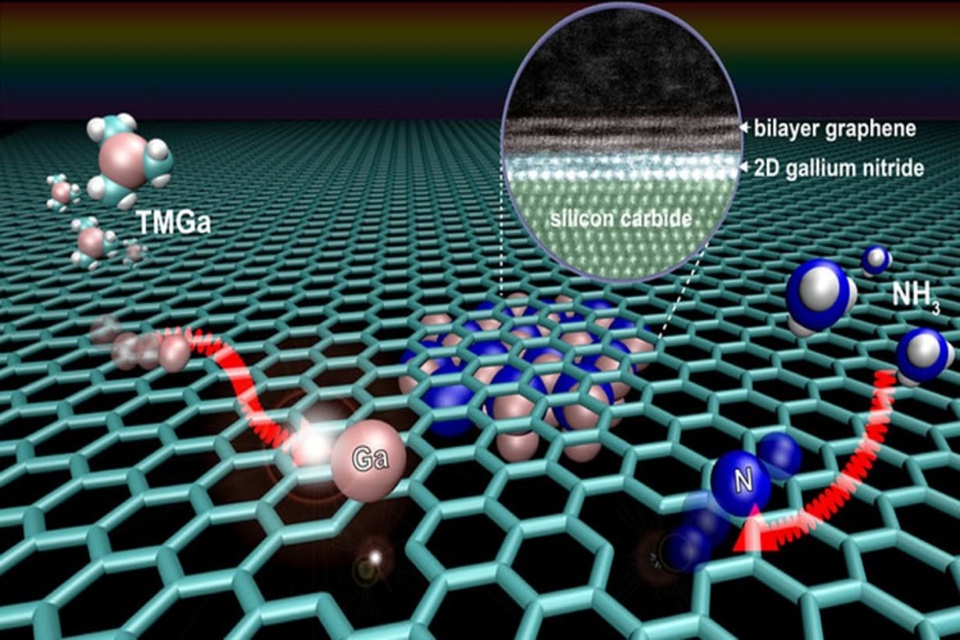 اتمهای گالیوم برای قرارگیری در بین دو لایهی گرافین اضافه میشوند و در نهایت برای آغاز شدن واکنش شیمیایی سازندهی ورقهای فوق باریک گالیوم نیترید محصور در گرافین، نیتروژن اضافه میشود.