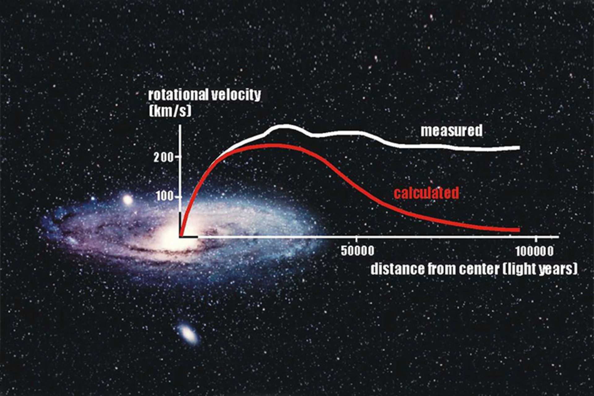 ناحیههای بیرونی کهکشانها -مثل کهکشان راه شیری خودمان- با سرعت بیشتری نسبت به مقدار محاسبهشده (با توجه به مقدار ماده معمولی مثل ستارگان، سیارات و گازهای میانستارهای) به دور مرکز کهکشان میچرخند. پس باید چیز دیگری باشد که این مقدار گرانش اضافی را ایجاد کرده است، بنابراین فیزیکدانان وجود ماده تاریک را پیشنهاد کردند. به نظر میرسد ماده تاریک جهان ما را تحتالشعاع خود قرار داده است و بیش از ۸۰ درصد کل ماده را شامل میشود. به قول معروف ذرات ماده تاریک تابهحال هرگز مشاهده نشدهاند، هرچند که تلاشهای بسیاری برای آشکارسازی آنها انجام شده است.