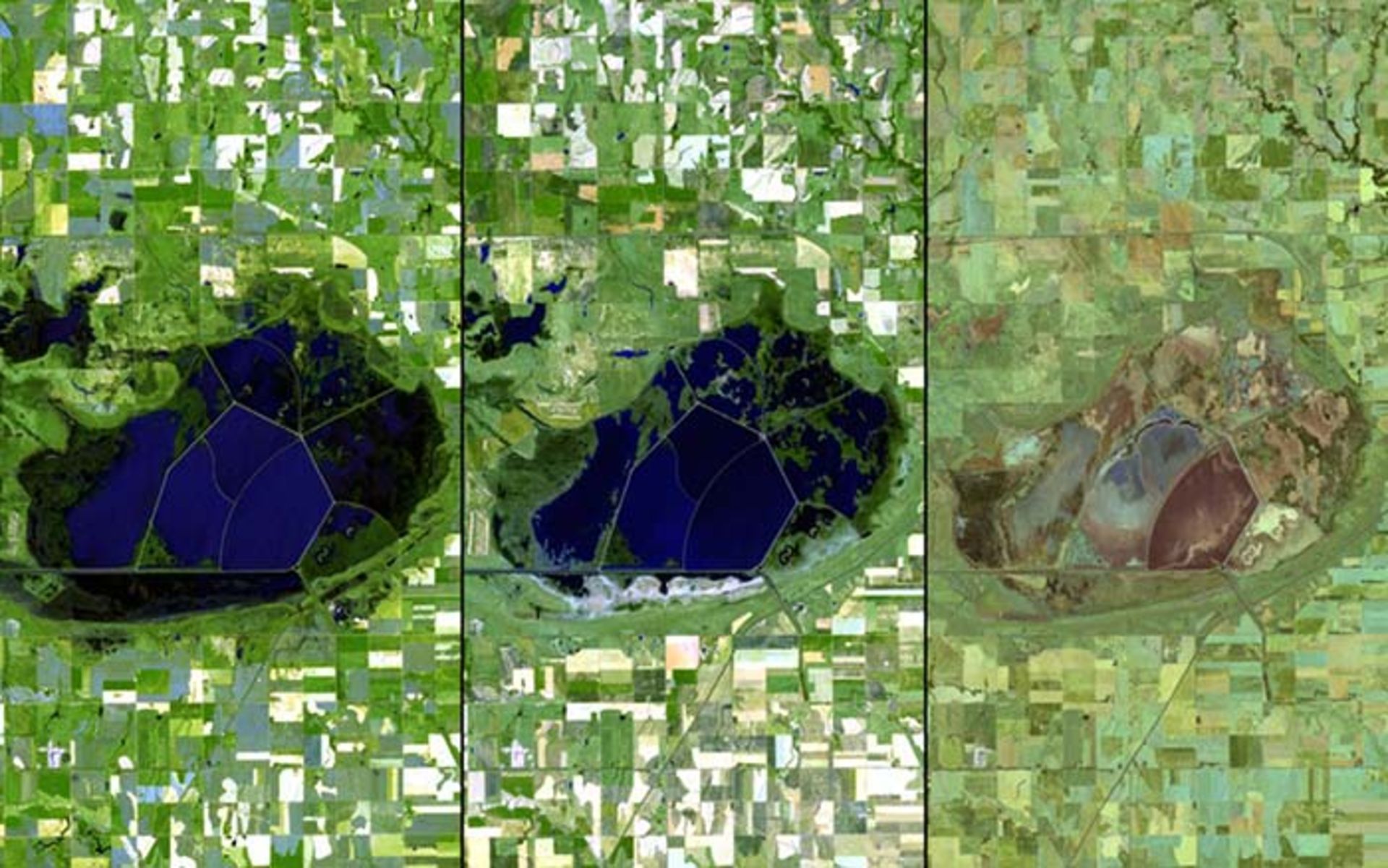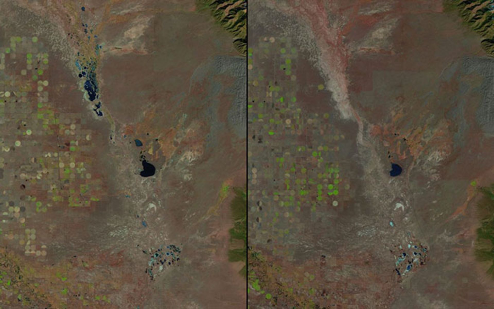 خشک شدن و تحلیل رفتن دریاچههای واقع در «پارک ملّی سن دونس» (San Dunes)، کلرادو.. قبل: ۱۹۸۷- بعد: ۲۰۱۱