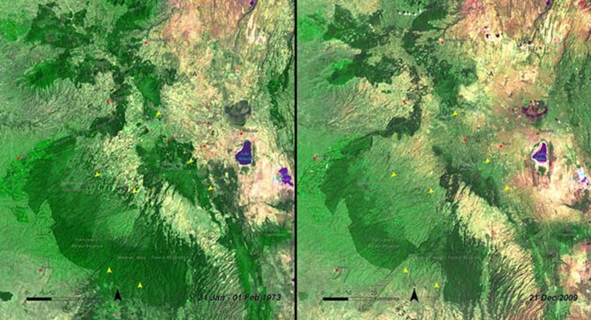 جنگل زدایی در «جنگل مائو» (Mau)، کنیا..... قبل: ژانویه ۱۹۷۳- بعد: دسامبر ۲۰۰۹