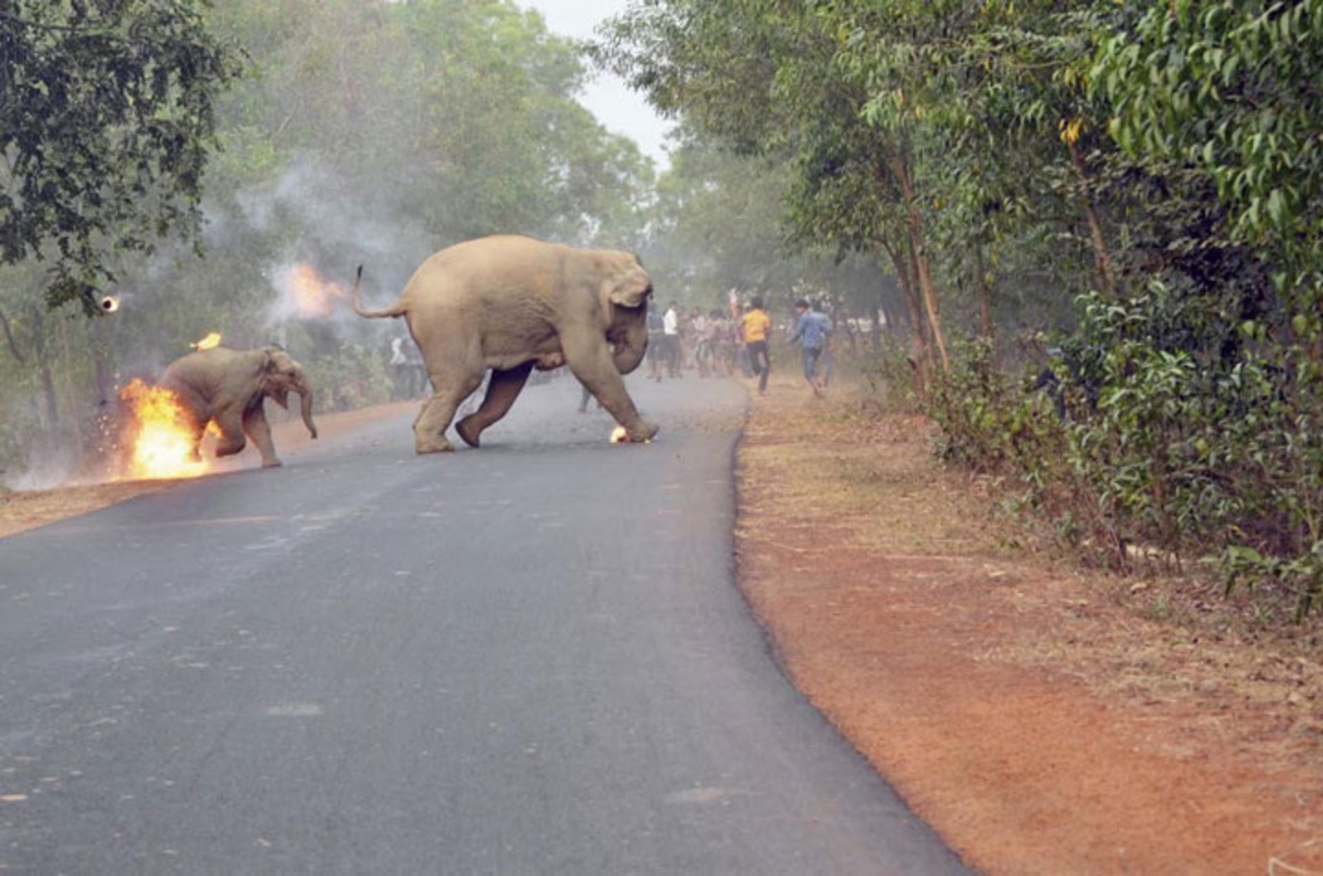 این تصویر تکاندهنده، فیلهایی را نشان میدهد که توسط عدهای، در جادهای که از میان جنگل میگذرد، مورد حمله قرار گرفتهاند. پاهای فیل کوچک در آتش میسوزد و او درحالیکه جیغ میکشد، به دنبال مادر خود در حال فرار است.