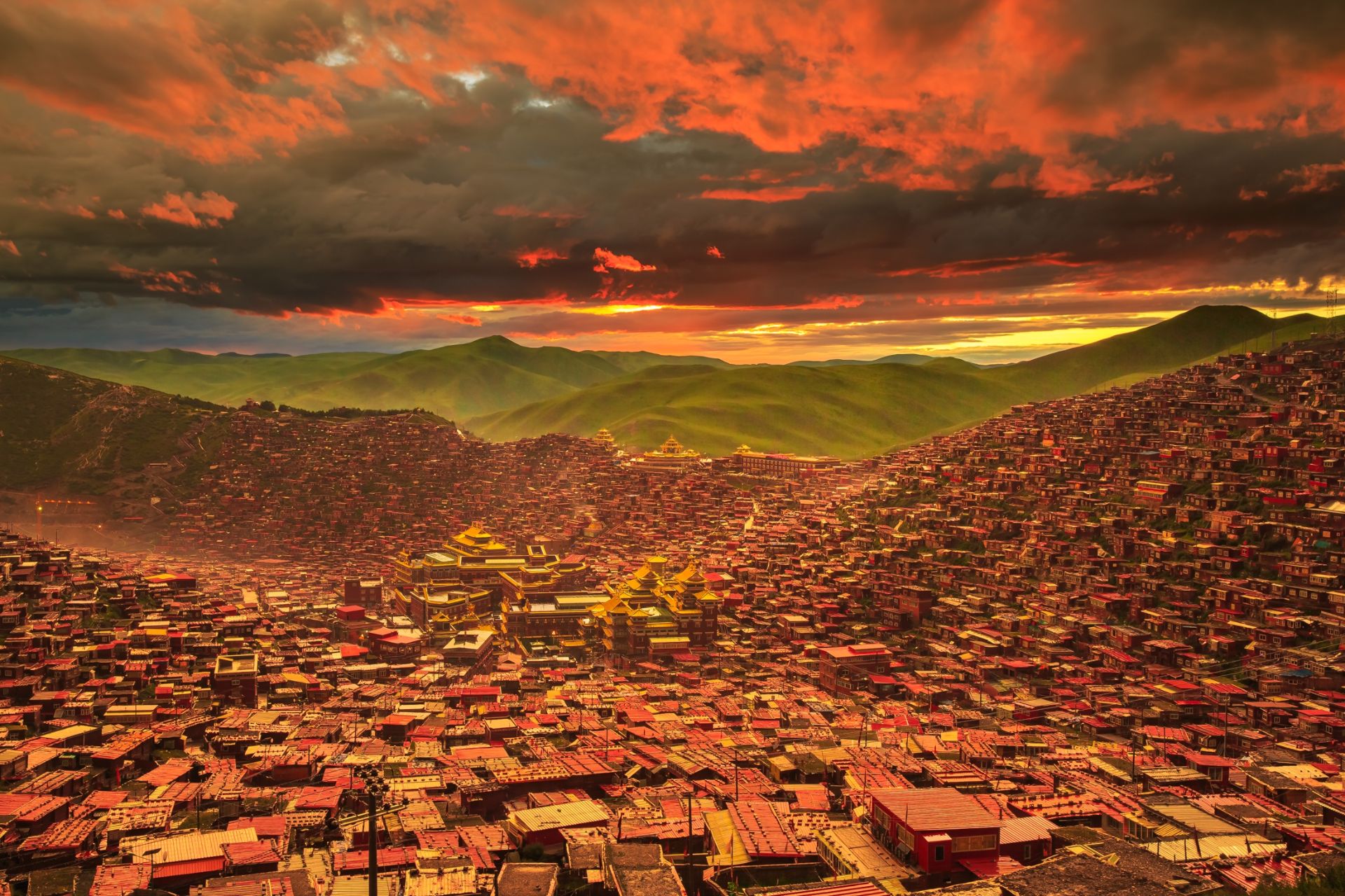 این تصویر از ارتفاعات چهار هزار متری سیچوان چین به ثبت رسیده است. این مکان پس از یک بارندگی شدید، در حوالی غروب آفتاب قرمز به نظر میرسد. «لارونگ گار» بزرگترین آکادمی بودایی تبتی در جهان نیز در این تصویر به چشم میآید. لارونگ گار، در پانزده کیلومتری شهر سرتار، یکی از بزرگترین مراکز تعیلم راهبها و راهبههای بودایی است که حدود چهل هزار نفر در آن آموزش میبینند. در جایی میان درههای سرسبز کوهستانهای لارونگ گار در چین، هزاران خانه قرمزرنگ ساخته شده که محل زندگی اعضای بزرگترین مدرسهی بودایی جهان یعنی مدرسه لارونگ گار است.این روستا از دههی ۱۹۸۰ میلادی تاکنون محل زندگی چهل هزار راهب بودایی است. راهبان بودایی در این مکان به دور از سروصدای شهرها و آلودگی به مطالعه و امور دینی میپردازند. کلبههای چوبی آنها به فاصلهی بسیار نزدیکی از یکدیگر ساخته شده است و همه به رنگ قرمز هستند. در این روستا راهبها و راهبهها بر حسب سن و جنس در کلبههایی ساده با دو الی سه اتاق زندگی میکنند. در این مکان، تلویزیون ممنوع است و همه باید تمام وقت خود را صرف مطالعه و نیایش کنند.