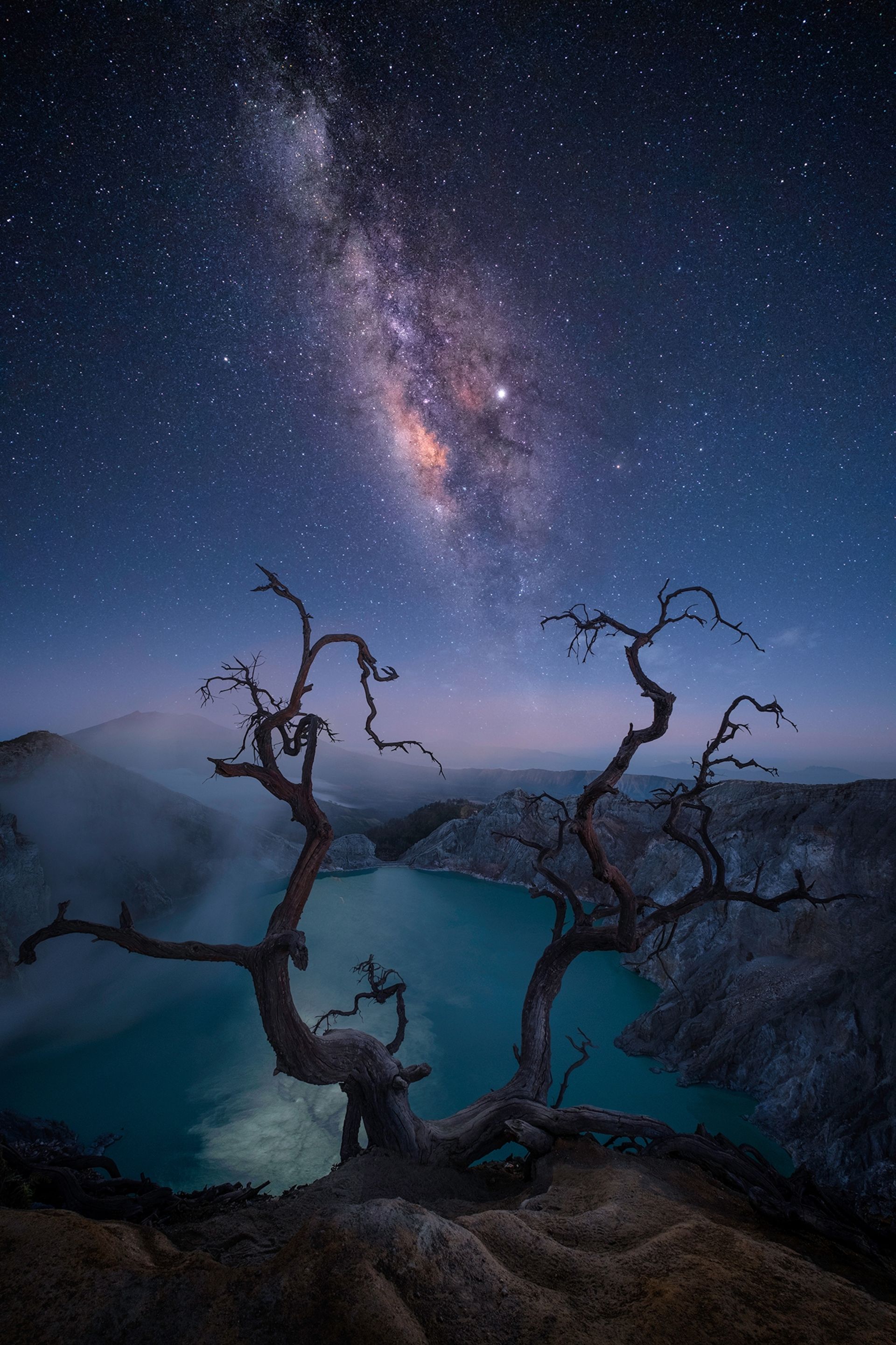 تنها یک کوه آتشفشان در دنیا وجود دارد که آتش آبیرنگ از آن خارج میشود و دریاچهی بسیار بزرگ اسیدی در اطرافش تشکیل شده و آن، آتشفشان کاوا آیجن (Kawah Ijen) واقع در جاوای شرقی اندونزی است.دریاچهی فیروزهای دهانهی آتشفشان کاوا آیجن، بهشدت آرام و جذاب به نظر میرسد. نکتهی اصلی این تصویر، تماشای طلوع راه شیری در قلهی دهانهی این آتشفشان است که آن را به یکی از زیباترین تصاویر ثبتشده تبدیل کرده است.