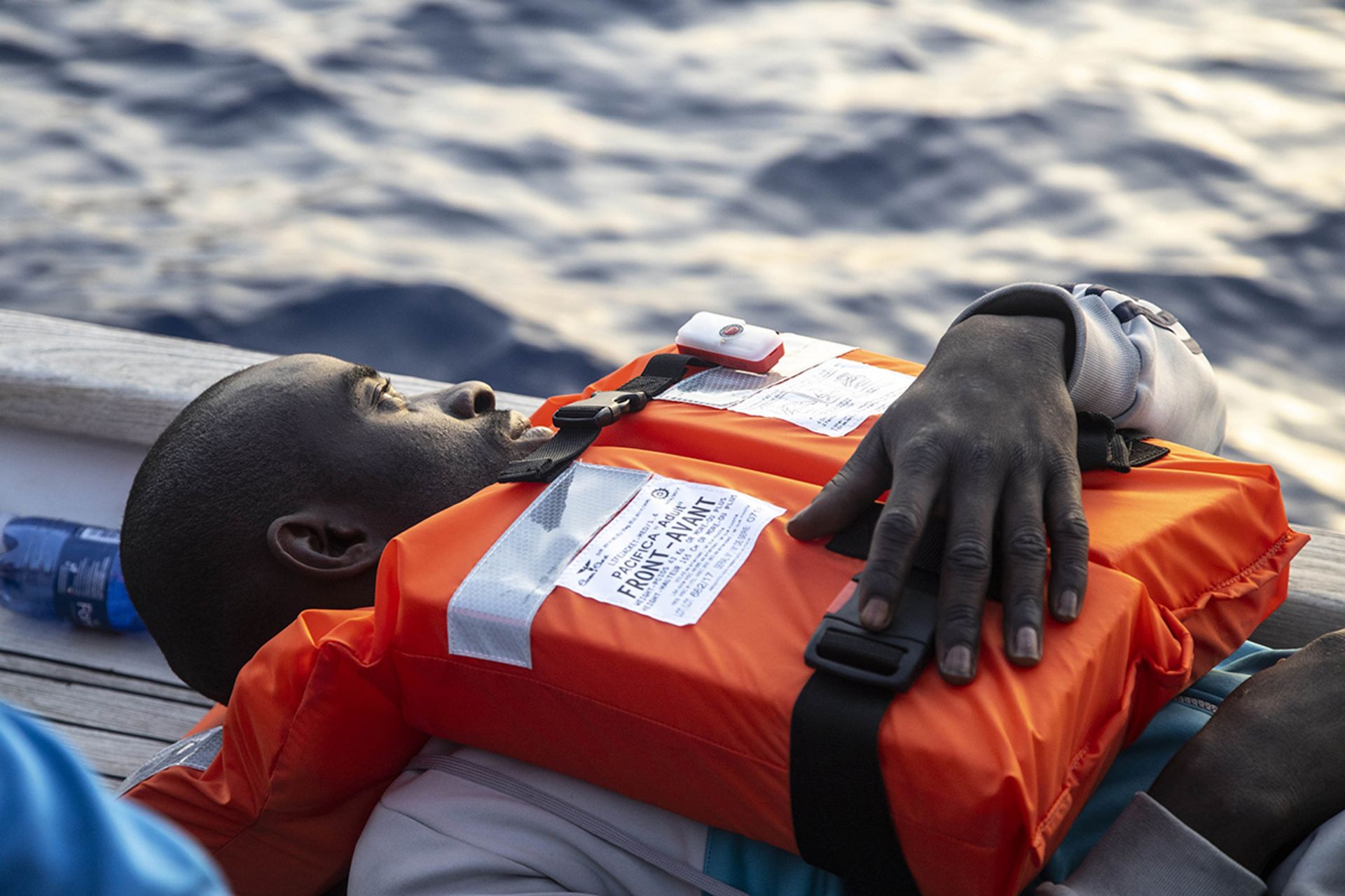 یک مرد مهاجر که قصد مهاجرت غیر قانونی از لیبی داشت، پس از نجات از دریا توسط سازمان «انسانهای نجاتیافته در مدیترانه» در کنار مدیترانهی مرکزی، هنگام غروب خورشید به افق نگاه میکند.