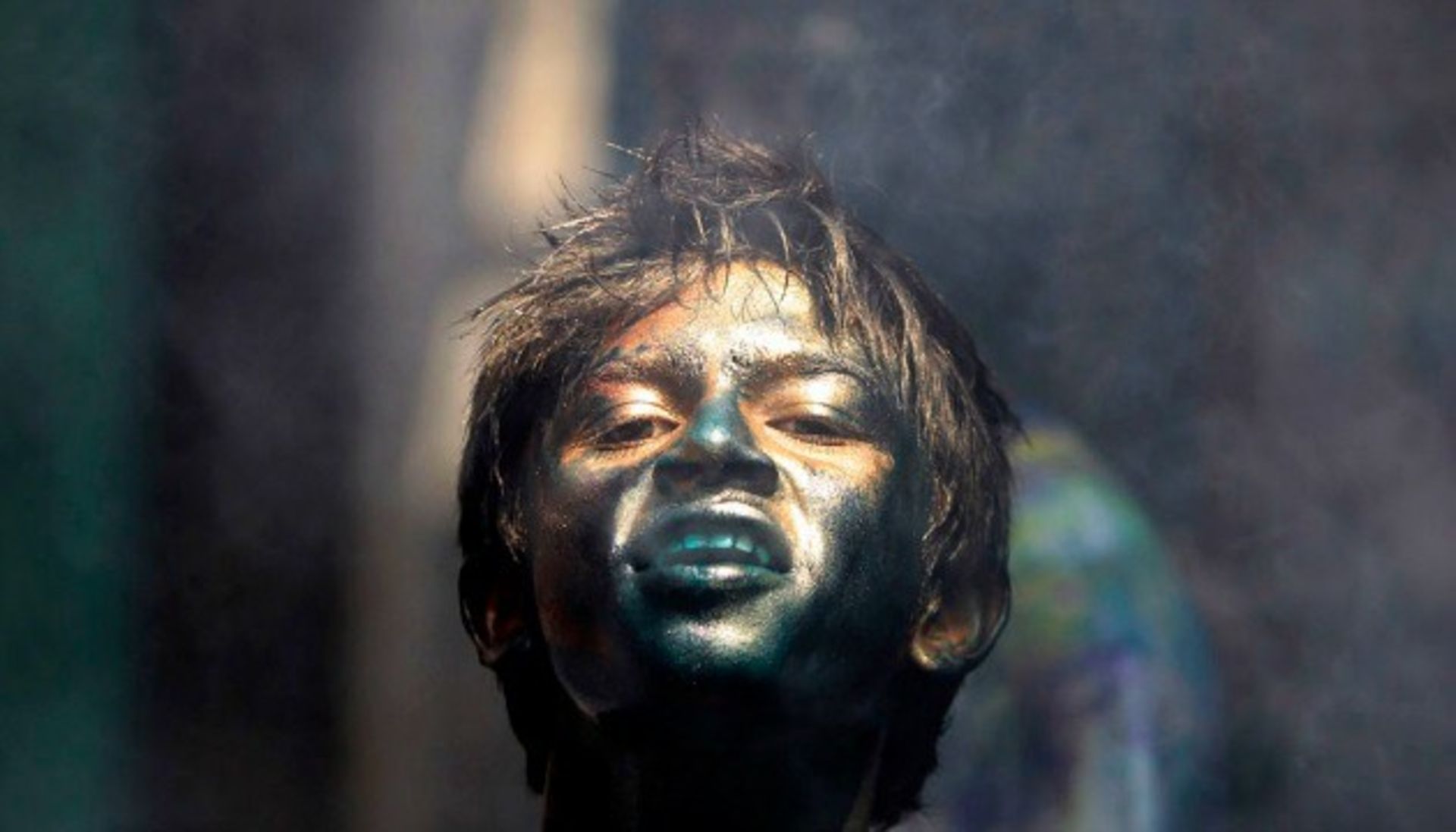 یک کودک بنگلادشی با چهرهای پوشیده از رنگ.