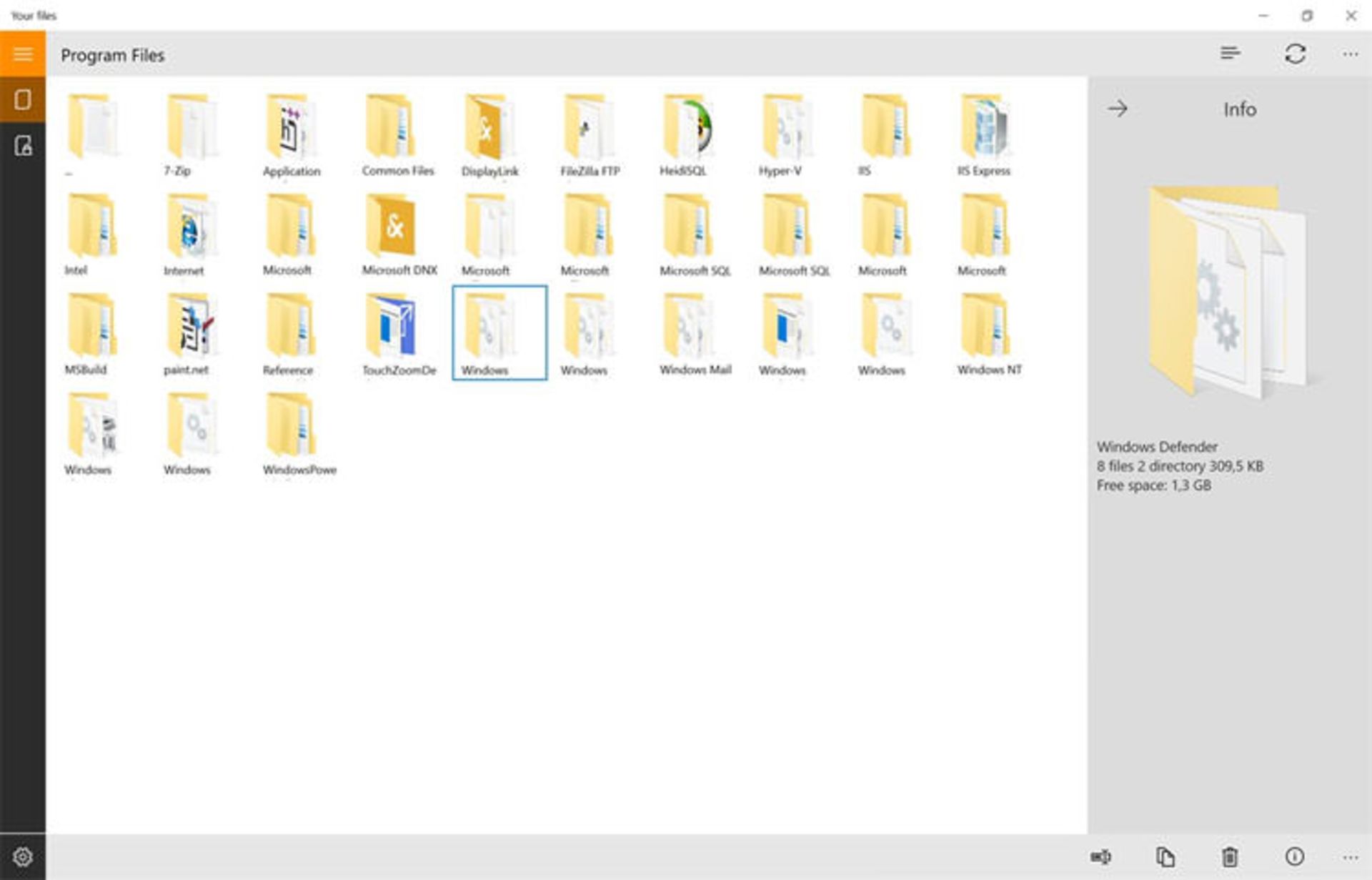 Your Files برای طراحی، به ویژه در نسخهی قابل نصب در ویندوز ۱۰، از رابط کاربری فایل منیجر ویندوز الهام گرفته است و طراحی پوشهها و پنجرهها در آن شباهت بسیاری به طراحی فایل منیجر اصلی ویندوز دارد. البته نسخهی مربوط به ویندوزفون ۸.۱ از طراحی اصلی این برنامه متفاوت است که میتوانید در تصویر زیر آن را مشاهده کنید.