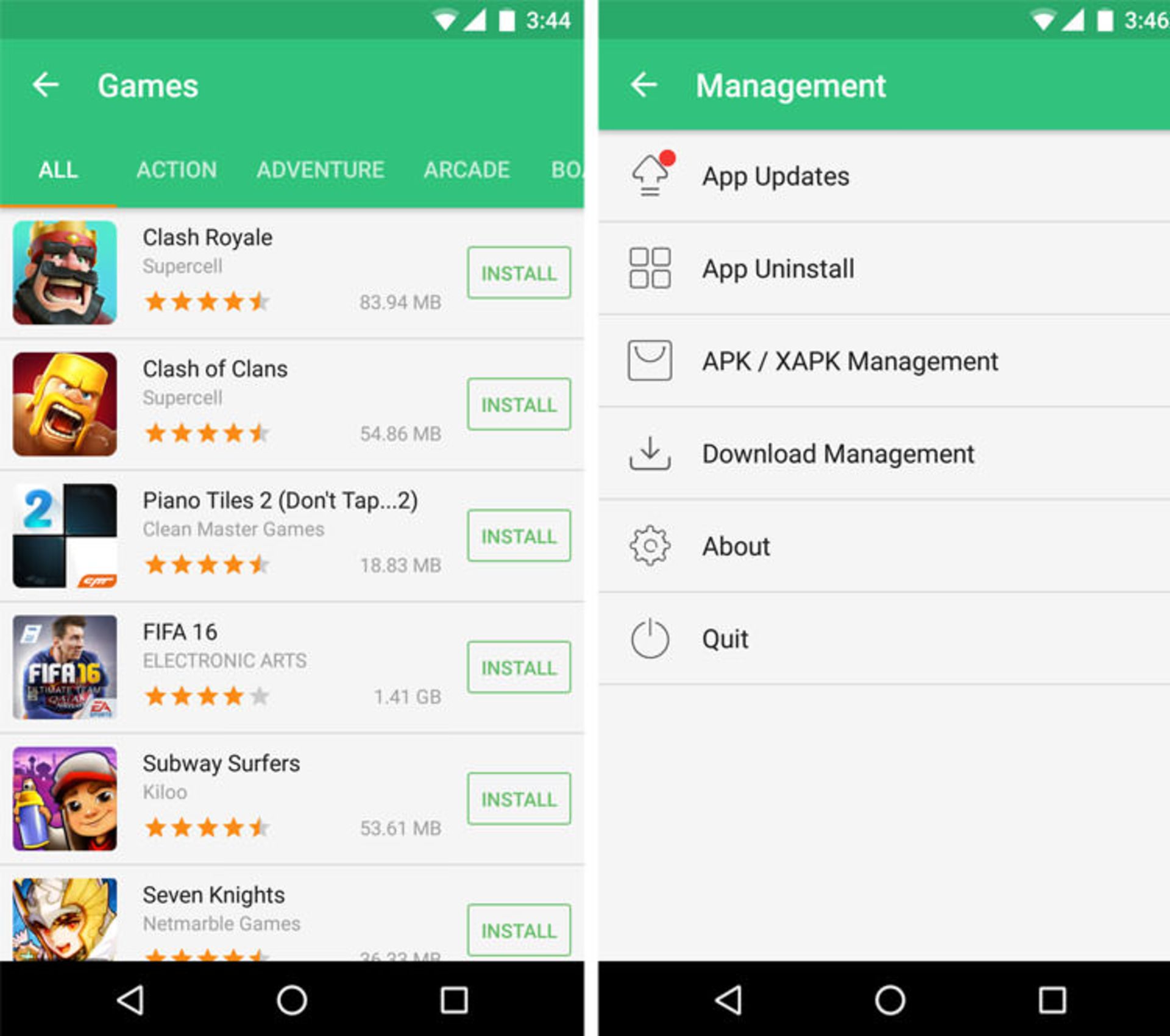 بخش جستجوی APKPure نیز فوق العاده بهینه طراحی شده است به طوری که با جستجوی نام یا آیدی اپلیکیشنها، میتوانید به راحتی هر چه تمامتر اپلیکیشن مورد نظر خود را پیدا کنید. همانطور که مطلع هستید پلی استور مدتها است که در ایران قابل استفاده نیست و حتی در روزهای اخیر نیز که لینک و عکسهای آن برای کاربران ایرانی قابل دسترس شدهاند، همچنان بیش از نیمی از اپلیکیشنها پیام "Not For Your Country" را نمایش میدهند. توسط APKPure میتوانید یک جایگزین شایسته برای پلی استور در اختیار داشته باشید که علاوه بر آنکه مشکلی در نمایش عکسها ندارد، تمام اپلیکیشنهای آن، حتی اپلیکیشنهای مخصوص یک کشور خاص نیز قابل دانلود خواهند بود. اگر به خاطر داشته باشید یکی از ویژگیهای فوق العادهی وب سایت APKPure ارائهی فایل Xapk از بازیهای دیتا دار بود که به کمک آن می توانستید بازی و دیتا را به صورت یکجا دانلود کنید و توسط اپلیکیشن مخصوص مدیریت فایلهای XAPK به نصب آنها بپردازید. خوشبختانه این اپلیکیشن نیز با اپلیکیشن APKPure ادغام شده است و از منوی کناری مارکت APKPure میتوانید به سادگی به نصب فایل دانلود شده بپردازید. در تب Updates نیز هر اپلیکیشن نصب شده در گوشی شما که دارای نسخهی جدیدتری در APKPure باشد به شما نمایش داده خواهد شد که می توانید به سادگی به آپدیت کردن برنامهها و بازیهای خود بپردازید.