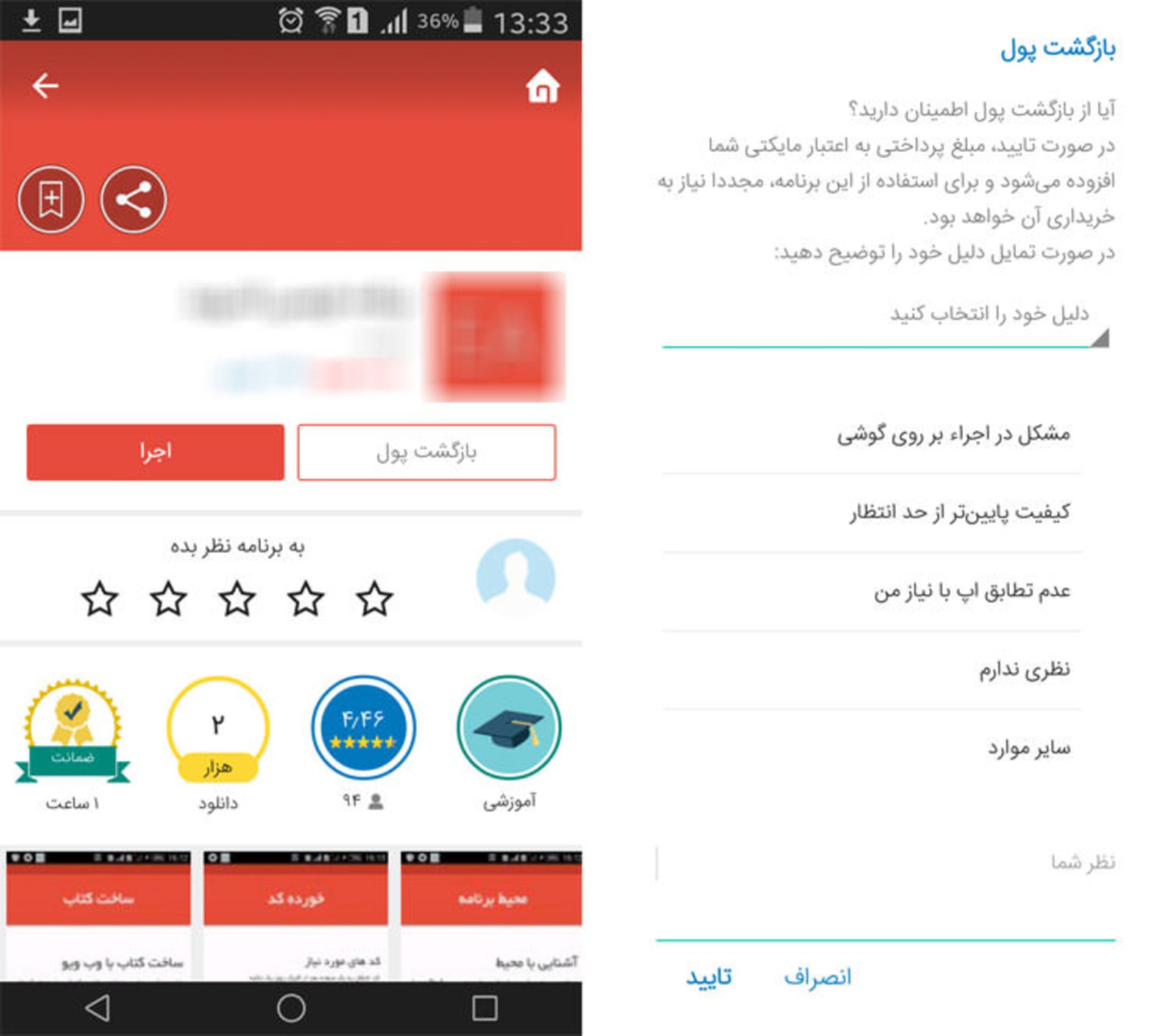 یکی دیگر از ویژگیهای متفاوت و خاص مایکت که برای اولین بار در مارکتهای ایرانی شاهد آن بودیم امکان بازگشت وجه در صورتی نارضایتی از اپلیکیشنهای خریداری شده است. احتمالا برای شما هم پیش آمده است که هنگام خرید یک اپلیکیشن پولی، فریب اسکرین شاتها یا وعدههای تبلیغاتی آنها را خورده باشید و بعد از خرید متوجه شوید که برنامهی خریداری شده با چیزی که به شما وعده داده شده بود تفاوت بسیاری دارد. توسط این امکان شما می توانید بعد از پرداخت هزینه و خرید یک برنامه، تا زمان مشخصی اگر از برنامهی خریداری شده راضی نبودید درخواست بازگشت وجه دهید تا بدون هیچ سوال یا محدودیتی، وجه پرداخت شده به اکانت مایکت شما برگشت داده شود. در صفحهی هر برنامه مدت زمانی که برای گارانتی و بازگشت وجه در نظر گرفته شده، درج شده است که می توانید نمونهی آن را در تصویر بالا مشاهده کنید. بعد از انجام خرید، تا زمان معین شده، گزینهی بازگشت پول را مشاهده خواهید کرد که می توانید با لمس آن، وجه خود را پس بگیرید.