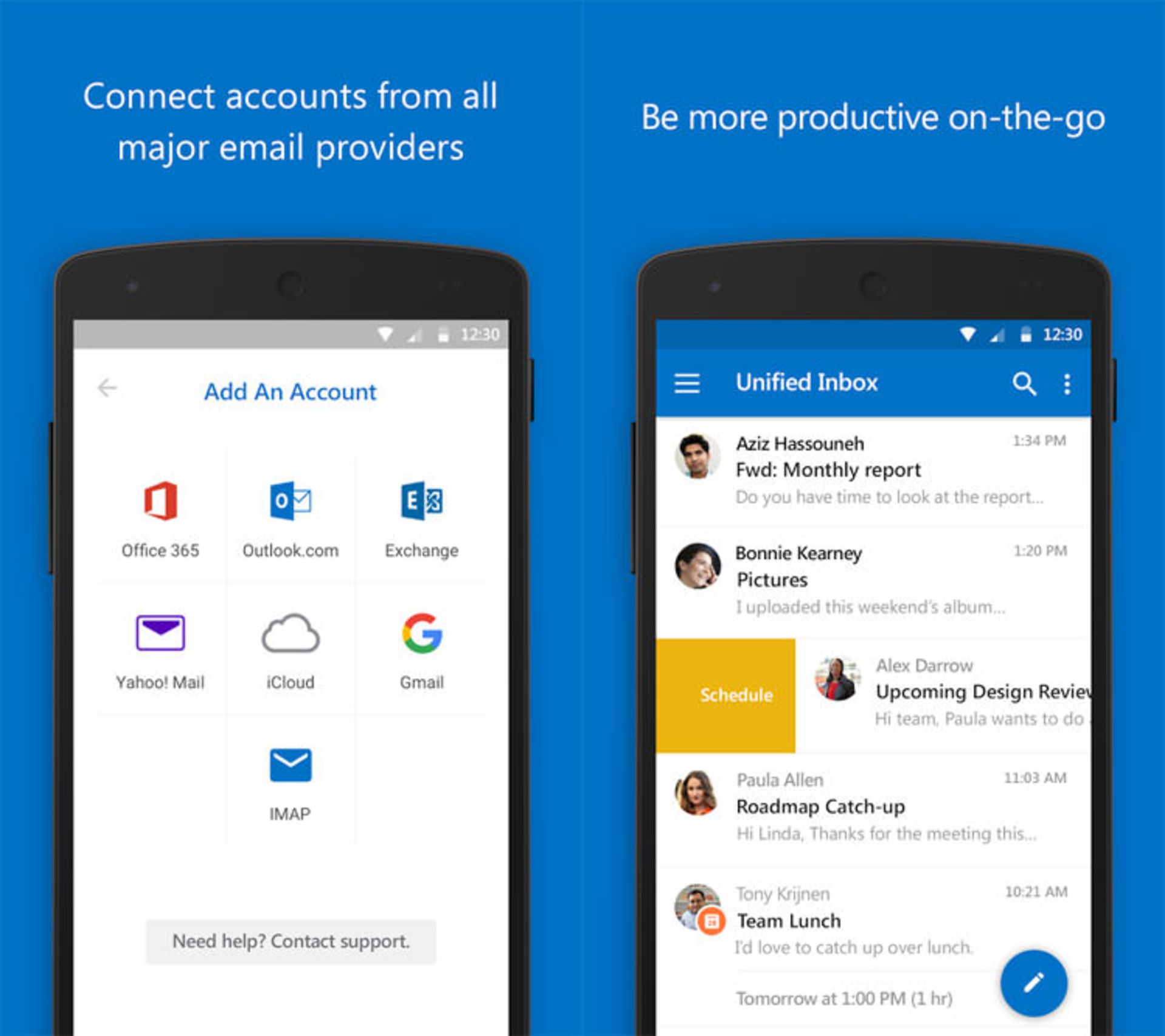 یکی از شناخته شدهترین اپلیکیشنهای مایکروسافت در پلتفرم اندروید Outlook نام دارد که دارای بیش از ۵۰ میلیون دانلود در پلیاستور بوده و وظیفهی اصلی آن مدیریت ایمیلهای مایکروسافت با پسوندهای Hotmail ,Live و Outlook است. این برنامه که از رابط کاربری بسیار خوبی برخوردار است دارای ۲۰ مگابایت حجم بوده و برای اجرا به اندروید ۴.۰.۳ یا بالاتر نیاز خواهد داشت. توسط این برنامه میتوانید به طور کامل ایمیلهای خود را در موبایل مدیریت کنید و اقداماتی مانند ارسال یا دریافت نامههای الکترونیکی را به انجام برسانید. امکانات و رابط کاربری Outlook به قدری کامل و بینقص است که شما را برای مدیریت ایمیل خود، به طور کامل از کامپیوتر بینیاز خواهد کرد.