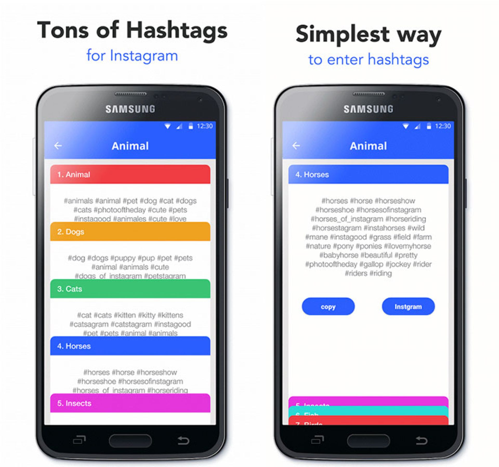 InstaTags اپلیکیشنی بسیار جالب برای گوشیهای اندروید است که به کمک آن به مجموعهای از هشتگهای آماده و از قبل نوشته شده در دسته بندیهای مختلف دسترسی خواهید داشت. کافی است تا برای مثال به دسته بندی Animals رفته و سپس حیوان مورد نظر خود را انتخاب کنید تا با مجموعهای از هشتگهای مختلف و مرتبط به آن حیوان روبهرو شوید. حال تنها کاری که باید کنید کپی کردن این هشتگهای آماده و پیست کردن آنها در اینستاگرام یا هر مکان دیگری که مایل هستید است تا به همین راحتی نیاز شما به هشتگ بدون هیچ گونه زحمتی برطرف شود. نکتهی مثبتی که در این برنامه وجود دارد نمایش و امکان کپی یکجای تمام هشتگها است به این معنا که با لمس گزینهی Copy در بخش پایینی هر دسته، میتوانید تمام هشتگهای نمایش داده شده را یکجا کپی کنید. این برنامه نزدیک به ۵۰۰ هزار بار از پلیاستور گوگل دانلود شده و با حجم ۵ مگابایتی برای اندروید ۴.۰.۳ یا بالاتر منتشر شده است. این برنامه تنها از زبان انگلیسی پشتیبانی میکند و در زمینهی هشتگهای فارسی کمکی به کاربر نخواهد کرد. البته این موضوع را نمیتوان صرفا یک ایراد دانست چراکه میتوان از این زاویه نیز به موضوع نگاه کرد که هشتگهای فارسی توسط هرکاربری قابل نوشتن خواهند بود و این هشتگهای انگلیسی هستند که به دلیل کم بودن دانش اکثر کاربران از زبان انگیسی، به یک همراه و کمک نیاز خواهد داشت. برای دانلود میتوانید از لینک زیر استفاده کنید.