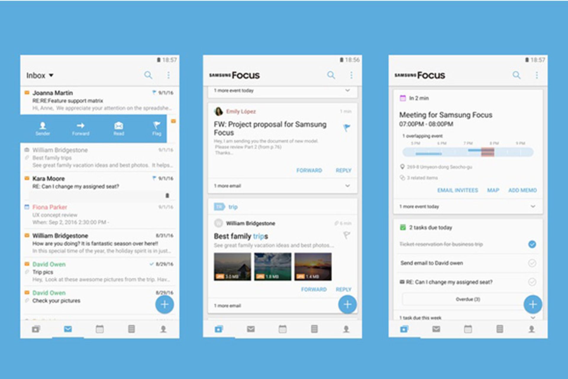 اپلیکیشن فوکوس سامسونگ با عنوان اپلیکینشی با بهرهوری یکپارچه شناخته میشود که این امکان را برای کاربران سرویسهای Active Sync، IMAP و POP3 فراهم میکند تا بتوانند ایمیل، تقویم، وظایف، یادداشتهای و مخاطبان خود را در مکانی واحد بهتر مدیریت کنند.