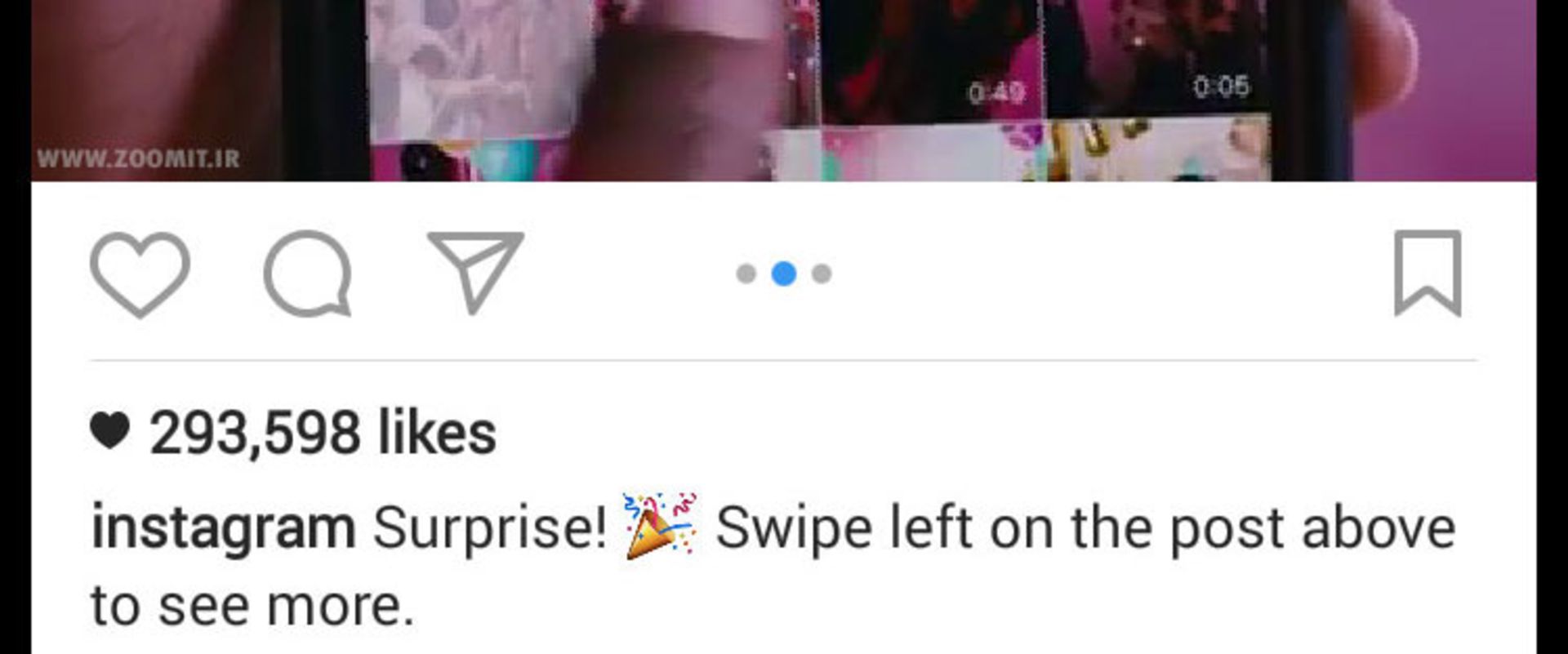 نمایش پستهای Multiple مانند پستهای عادی خواهد بود؛ اما یک نشانهی کوچک که بهنوعی بیانگر چندگانه بودن پست مورد نظر باشد، در آنها وجود دارد. این نشانه به ۲ صورت طراحی شده است. اگر در صفحهی فیدها هستید نشانهی مورد نظر بهصورت یک آیکون چندنقطهای در زیر پست و در بین آیکونهای کامنت و بوکمارک قرار خواهد گرفت (اسکرینشات بالا). اگر هم به پروفایل شخص مورد نظر مراجعه کردهاید یا در صفحهی تصاویر لایک شده قرار دارید و پستها را بهصورت ردیفهای سهتایی مشاهده میکنید، این نشانه را بهصورت یک آیکون چندپنجرهای درجشده روی پیشنمایش پست مشاهده خواهید کرد.