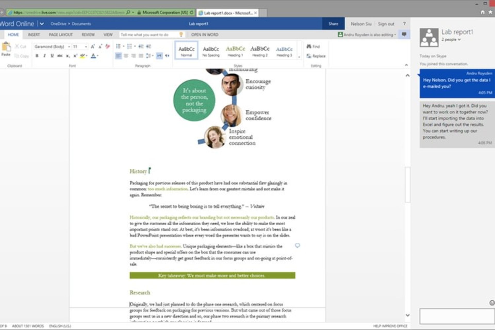 همانطور که گفتیم، مایکروسافت امکان گفتگو را تنها در اپلیکیشن تحت وب وُرد و پاورپوینت در اختیار کاربران قرار داده، از اینرو در حال حاضر نمیتوان هنگام استفاده از نسخهی تحت وب اکسل و واننت، از این قابلیت بهره گرفت. سرویس گفتگو در قالب اپلیکیشنهای تحت وب، که پیشتر برای آتلوک و واندرایو هم ارایه شده، مبتنی بر بستر اسکایپ است، بنابراین میتوان بعدها متن گفتگوها را در قالب اپلیکیشن اسکایپ مشاهده کرد.