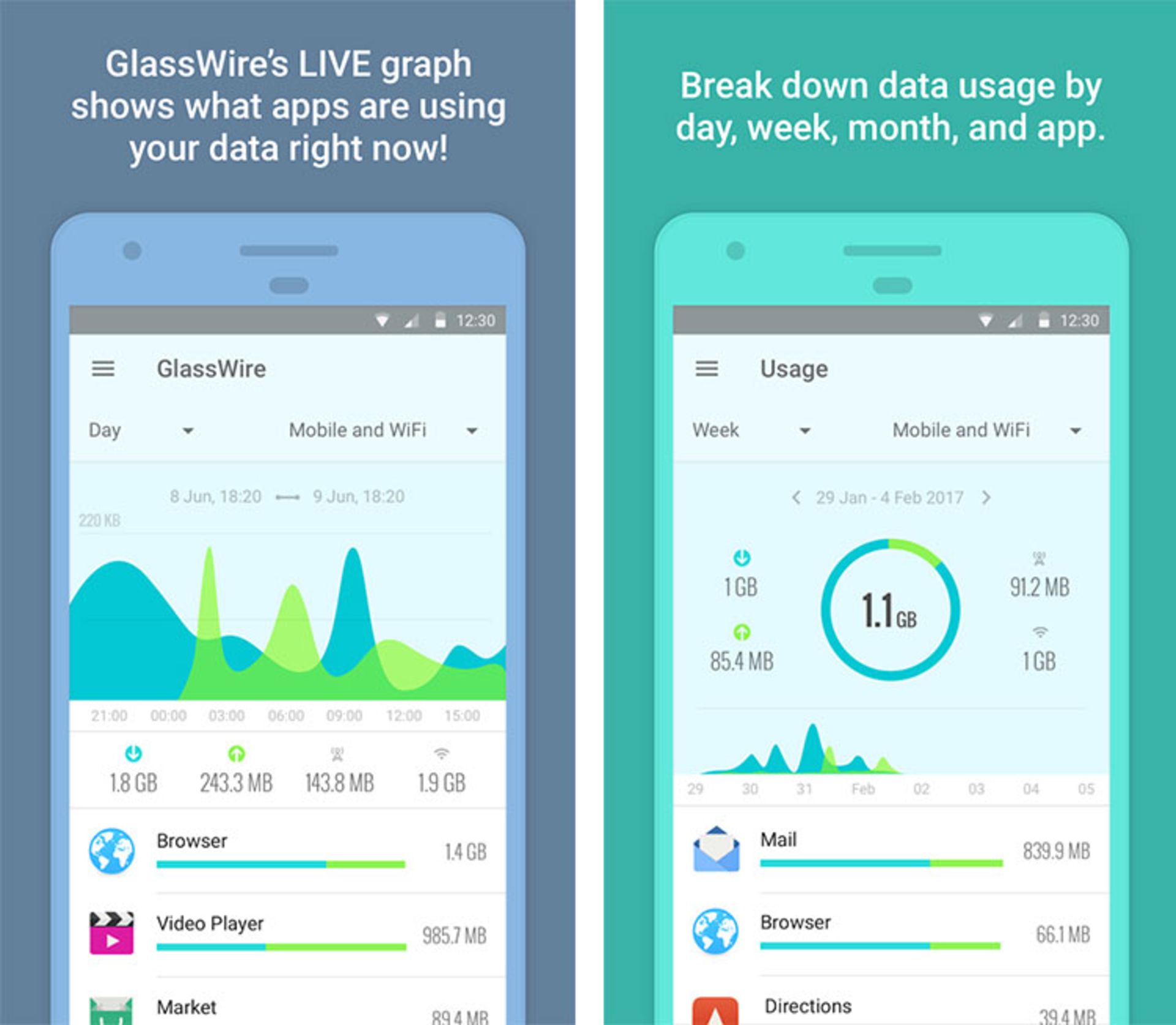 GlassWire از هر دو ارتباط اینترنتی وای‌فای و سیم‌کارت پشتیبانی می‌کند و فارغ از آنکه از کدام یک برای ارتباط اینترنتی خود استفاده می‌کنید، این برنامه قادر است مصرف آن را تحت نظر بگیرد. نکته‌ی جالبی که در GlassWire وجود دارد گراف زنده و Live است به طوری که با اجرای برنامه، می‌توانید برنامه‌هایی را که در همان لحظه مشغول مصرف ترافیک هستند مشاهده کنید. بازگشت به زمان نیز وجود دارد و شما برای مثال می‌توانید مصرف اینستاگرام را در روزهای گذشته نیز مشاهده کنید. گزارش‌های روزانه و هفتگی به مرور تهیه و تنظیم می‌شوند و در نهایت با ترکیب آن‌ها، گزارش‌های ماهانه و حتی سالانه در اختیار شما قرار می‌گیرد. نکته‌ی جالب بعدی امکان اعمال محدودیت برای حجم مصرفی است. برای مثال اگر یک بسته‌ی ۳ گیگابایتی را خریداری کرده‌اید می‌توانید با تنظیم اخطار روی ۲ گیگ، به محض رسیدن حجم مصرفی به این رقم توسط نوتیفیکیشن با خبر شوید تا بتوانید باقیمانده‌ی حجم را با احتیاط و کنترل بهتری مدیریت کنید. GlassWire حدود ۵۰ هزار دانلود در پلی‌استور گوگل ثبت کرده است و برای اجرا به اندروید ۴.۴ یا بالاتر نیاز دارد.