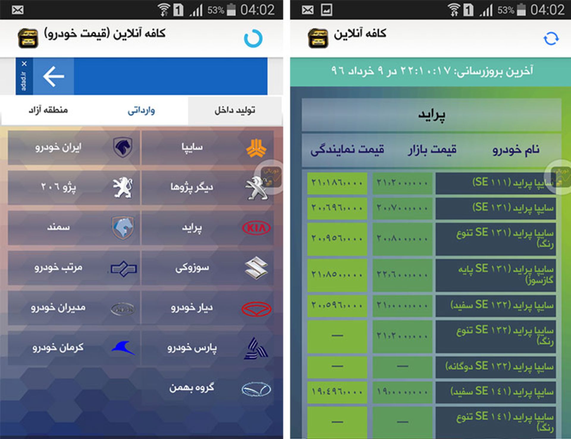کافه آنلاین اپلیکیشنی بسیار کاربردی برای علاقهمندان به دنیای خودرو است که به صورت جامع شما را از قیمت خودروهای داخلی، وارداتی و منطقه آزاد باخبر میکند. برخلاف مبحث ارز و سکه و گوشیهای موبایل که مراجع بسیاری برای آنها وجود دارد، خودروها دارای منابع انگشت شماری هستند که میتوان در آن به دیتابیس کاملی از خودروها و قیمتهای روز آنها دسترسی داشت. کافه آنلاین (قیمت خودرو) برنامهای برای اندروید است که در آن به لیستی جامع و کامل از ۲۰۰۰ خودرو دسترسی خواهید داشت که در دستههای مختلفی همچون داخلی، وارداتی و منطقه آزاد در اختیار شما قرار گرفتهاند. سمند، ۲۰۶، پراید، لیفان و... در خودروهای داخلی، شورلت، کیا، سانتافه و... در خودرهای وارداتی و لکسوز، بنز، مازراتی و... نیز در خودروهای منطقه آزاد قرار گرفتهاند که میتوانید با مراجعه به هر بخش، قیمتهای بهروز آنها را مشاهده کنید. در کافه آنلاین علاوه بر قیمت بازار خودروها، میتوانید قیمت نمایندگی را نیز در صورت وجود مشاهده کنید. محیط کاربری برنامه نیز با وجود آنکه چندان جذاب نیست اما قابل قبول است به خصوص در بخش دسته بندی موضوعی خودروها که به طور کاملا گویا خودروها را در اختیار شما قرار میدهد.