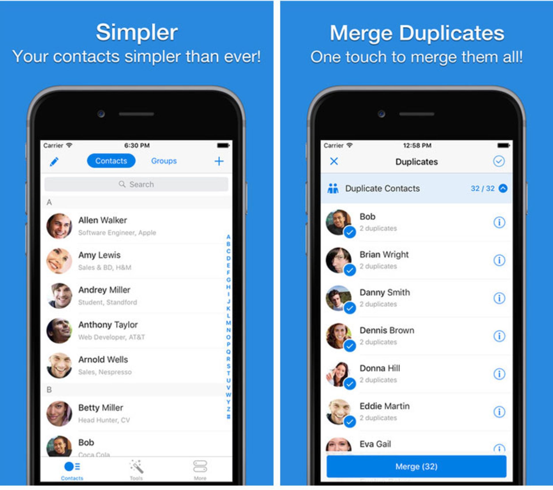 Simpler Pro اپلیکیشنی برای آیفون است که توسط آن میتوانید Contact-های خود را مدیریت کنید. احتمالا شما هم بارها با مخاطبان تکراری در گوشی خود مواجه شدهاید. در این مواقع معمولا انتخاب کردن دستیِ شمارههای تکراری و حذف یکجای آنها تنها راه چارهی کاربران خواهد بود که البته در صورت بالا بودن تعداد شمارههای تکراری، امری بسیار وقتگیر خواهد شد. از همین رو نیاز به ابزاری هوشمند دارید که بتواند بهصورت خودکار و با یک بار اسکن کردن شمارههای شما، موارد تکراری را شناسایی کند. Simpler Pro این وظیفه را بهخوبی برای شما انجام میدهد و بعد از پیدا کردن مخاطبان تکراری، آنها را حذف خواهد کرد. این برنامه در تشخیص مخاطبان تکراری، تنها به یکسان بودن شمارهها بسنده نمیکند و مواردی همچون یکسان بودن نامها و ایمیلهای ثبتشده را نیز بررسی خواهد کرد. نکتهی جالب این است که علاوه بر حذف مخاطبان کاملا تکراری، این برنامه امکان ادغام کردن مخاطبانی را دارد که در نام یکسان و در شماره متفاوت هستند. برای مثال اگر شمارهی منزل و موبایل یکی از دوستان خود را بهصورت جداگانه ذخیره کردهاید، Simpler Pro میتواند این دو آیتم را با هم ادغام کند. بکاپ گرفتن از شمارهها از دیگر ویژگیهای این برنامه است.
