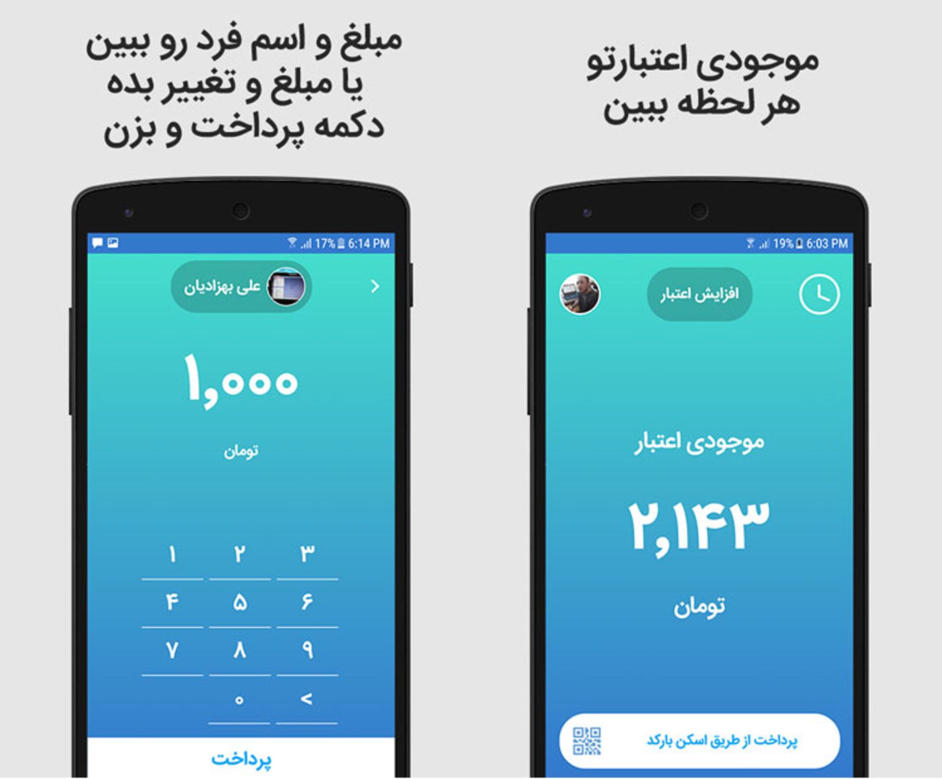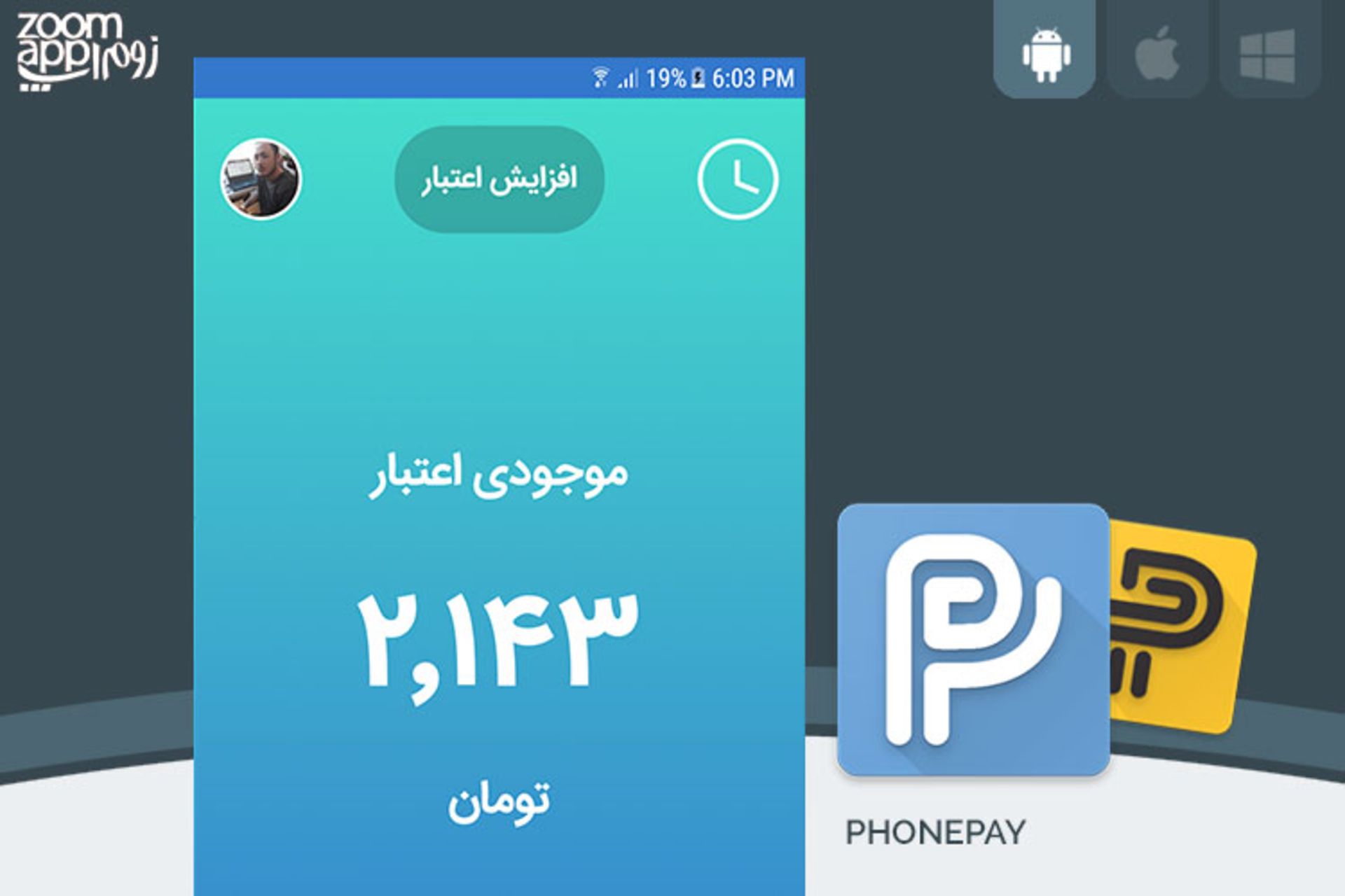 آشنایی با محیط برنامه: فونپی فوقالعاده ساده و خلوت طراحی شده است و همین موضوع باعث میشود کار با آن به راحتترین شکل ممکن قابل انجام باشد. شما در صفحهی اصلی برنامه با ۵ بخش مواجه خواهید شد. تاریخچهی پرداخت (آیکون ساعت)، افزایش اعتبار از طریق پرداخت آنلاین و ایمن، اطلاعات پروفایل (عکس، اسم و ...) سه بخش بالایی برنامه هستند. در بخش پایین نیز میزان موجودی فعلی شما و دکمهی پرداخت قابل رؤیت هستند. فونپی به مناسبت عضویت شما ۲ هزار تومان اعتبار هدیه به شما اهدا خواهد کرد. برای خرید شارژ بیشتر کافی است دکمهی خرید اعتبار را لمس کنید و پس از مشخص کردن مبلغ دلخواه، مانند یک خرید اینترنتی ساده حساب خود را شارژ کنید.