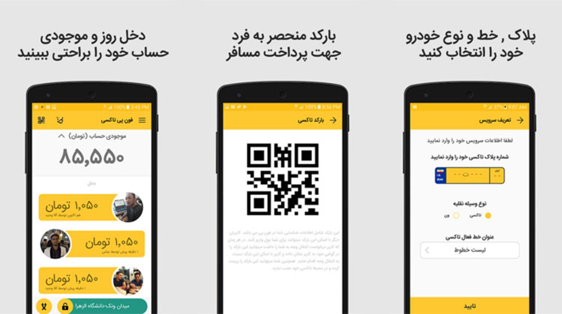 فونپی تاکسی اپلیکیشن دوم این تیم است که برای رانندگان منتشر شده است. اگر رانندهی تاکسی هستید و قصد استفاده از سرویس فونپی دارید، باید این نسخه را دانلود و در آن ثبت نام کنید. توجه داشته باشید که به عنوان راننده، شما دارای یک مرحلهی اضافه در ثبت نام یعنی اسکن بارکد تاکسی خود خواهید بود. بعد از انجام صحیح این مرحله، کار تمام است و تنها هنگام پرداخت، بارکد خود را در اختیار مشتری بگذارید تا با اسکن آن، مرحلهی پرداخت را انجام دهد.