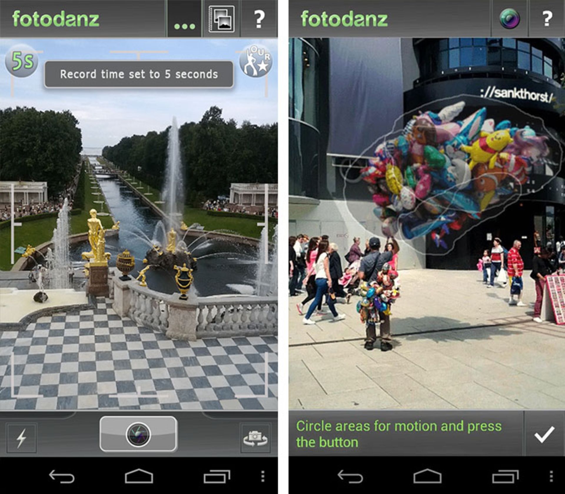 Fotodanz یکی از دو برنامهای است که برای اندروید معرفی خواهیم کرد. ساخت سینماگراف در این برنامه سادهتر از آن است که تصور کنید. بهمحض اجرای اپلیکیشن، دوربین برنامه اجرا خواهد شد و میتوانید با لمس گزینهی موجود، عملیات ضبط ویدیو را آغاز کنید. امکان ضبط با دوربین سلفی نیز امکانپذیر است. بعد از اتمام ضبط ویدیو و اطمینان از تکان نخوردن گوشی در زمان فیلمبرداری، تصویری ثابت از ویدیو به شما نمایش داده خواهد شد. با کمک انگشت خود، دور بخشی که قصد متحرک بودنش را دارید خط بکشید. اگر سوژهی متحرک سایه دارد، بهتر است برای جذابتر شدن سینماگراف دور سایه هم خطکشی کنید. بعد از مشخص کردن بخشهای مورد نظر، روی علامت تیک در انتهای صفحه لمس کنید تا در عرض چند ثانیه، سینماگراف شما ساخته شود.