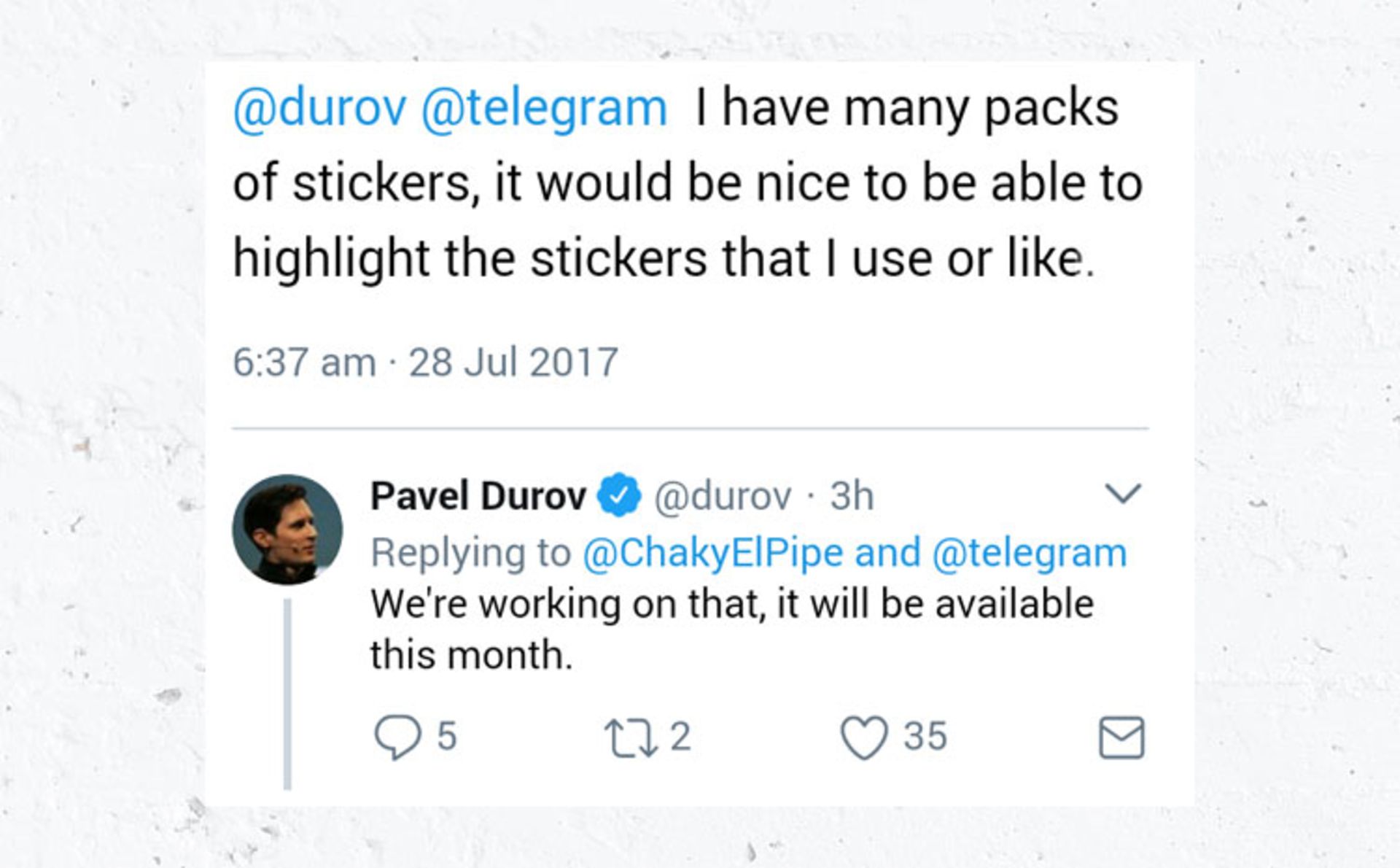 این کاربر گفته بود که بستههای استیکر بسیاری را در تلگرام خود دارد اما بهتر میشد اگر امکان مشخص کردن استیکرهای محبوب و پراستفاده و دسترسی سریع تر به آنها وجود داشت. پاول دورف نیز در پاسخ وی تایید کرد که در حال کار بر روی این موضوع هستند و در همین ماه (احتمالا آپدیت بعدی تلگرام) شاهد چنین قابلیتی خواهیم بود.
