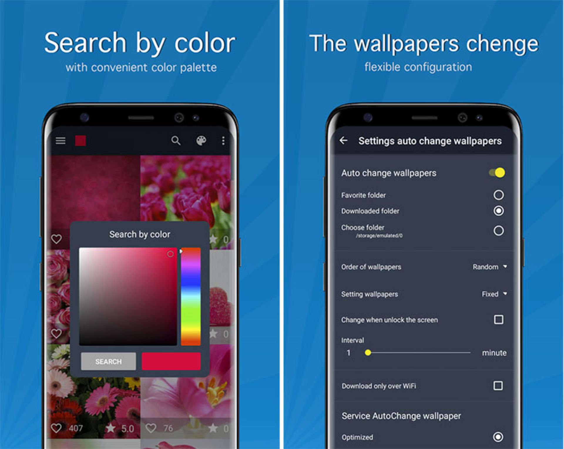 بیش از ۱۲۰ هزار تصویر زمینه آماده در برنامه وجود دارد و به گفتهی سازندگان، هرروز به این تعداد اضافه خواهد شد. تصاویر در موضوعات مختلفی دستهبندی شدهاند تا بتوانید والپیپر ایدهآل خود را سادهتر پیدا کنید. امکان جستجو بر اساس لغات مورد نظرتان نیز وجود دارد؛ اما موضوعی که این بخش را خاص و بسیار خلاقانه کرده، امکان جستجو بر اساس رنگ است. هر عکس یک کلیت رنگی مشخص دارد؛ برای مثال رنگ اصلی عکسی از باغ رنگ سبز و دریا رنگ آبی است. در بخش جستجوی Wallpapers HD & 4K میتوانید با مشخص کردن رنگ اصلی یک والپیپر، تنها عکسهایی را مشاهده کنید که در همان فضا باشند. نکتهی دیگری که Wallpapers HD & 4K را به یک اپلیکیشن عالی تبدیل کرده ، امکان تغییر خودکار والپیپر است. معمولا برای تغییر خودکار والپیپر در بازههای زمانی مختلف نیازمند اپلیکیشنهای جانبی هستیم؛ اما در این برنامه، علاوه بر دسترسی به یک آرشیو بزرگ میتوانید تغییر خودکار تصویر زمینه را نیز برای گوشی خود تنظیم کنید. برای دانلود برنامه اندروید Wallpapers HD & 4K میتوانید از لینک زیر استفاده کنید.