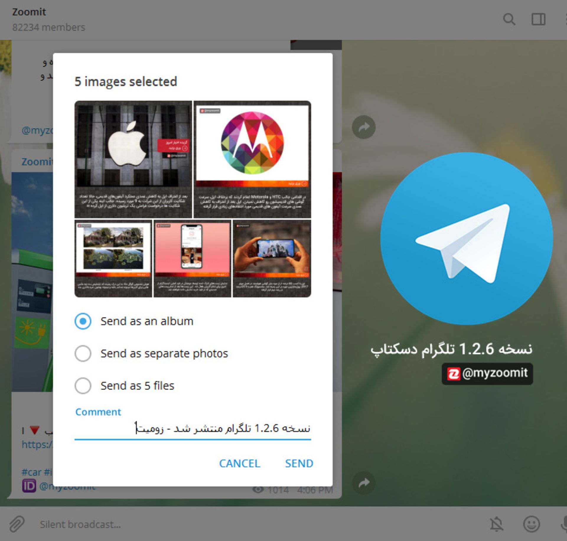 دقایقی پیش نسخه 1.2.6 تلگرام دسکتاپ منتشر شد و این ویژگی کاربردی به نسخه کامپیوتری این برنامه هم اضافه شد. از حالا در صورت ارسال چند عکس یا ویدیو به صورت همزمان، ۳ حالت "ارسال به شکل آلبوم"، "ارسال به شکل تکی" و "ارسال به صورت فایل" را در اختیار خواهید داشت. برای دانلود می توانید از لینک های زیر استفاده کنید.
