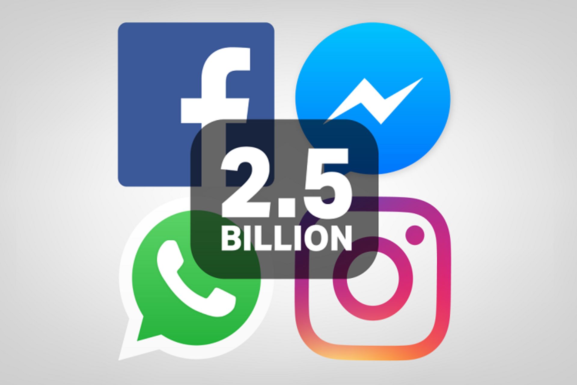 به گفتهی مدیران فیسبوک در ماه جاری برای اولین بار اعلام کرد که ۲.۵ میلیارد نفر در دنیا حداقل از یکی از اپلیکیشن یا سرویسهای این شرکت، از جمله فیسبوک، اینستاگرام، واتساپ یا مسنجر استفاده میکنند. این آمار بسیار ارزشمند است؛ به این دلیل شمار اشخاص حقیقی بهجای تعداد اکانتها در آن لحاظ شده است.