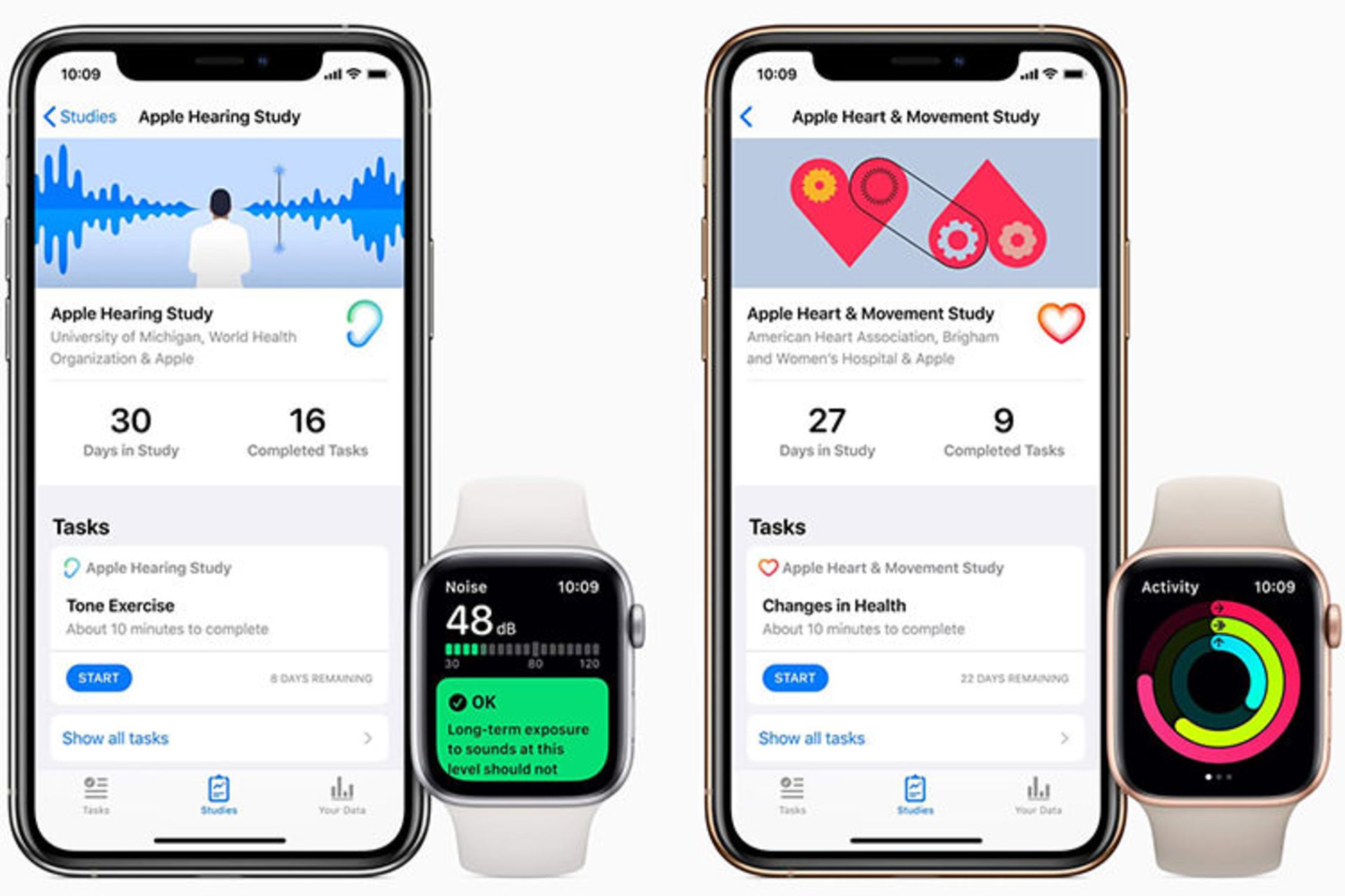 مطالعهی سلامت زنان که بلند پروازانهترین بخش مطالعات اپل است، داده هایی را از برنامه Cycle Tracking در watchOS 6 با هدف بهبود درک علمی از چرخهی قاعدگی جمعآوری میکند و رابطهی دورهی قاعدگی با شرایط مختلف سلامتی مانند سندرم تخمدان، ناباروی، پوکی استخوان و یائسگی را مورد بررسی قرار میدهد که اکنون اینکار از طریق برنامهی جدید اپل امکانپذیر خواهد بود. مطالعهی قلب و حرکت، از انواع سیگنالهای ساعت هوشمند، اطلاعات مربوط به میزان حرکت و میزان سلامتی را بدست میآورد و این میتواند بینشی در مورد اعلان اولیه برای بیماریهای قلبی و کاهش تحرک را فراهم کند. مطالعهی شنوایی نیز، تأثیر قرار گرفتن در معرض صدا بر سلامت شنوایی و اینکه چگونه صدا میتواند بر استرس و سلامت قلب و عروق تأثیر بگذارد را بررسی میکند.