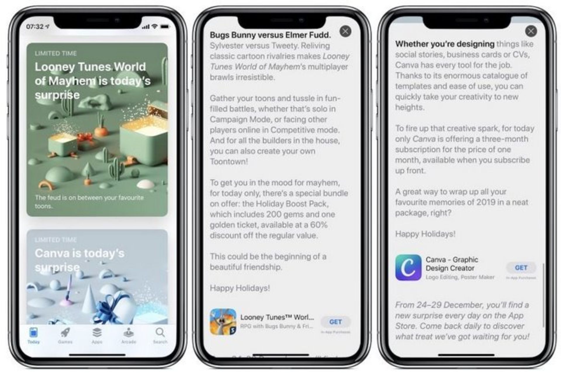 چهار روز پیش اپل اعلام کرد به مناسبت فرا رسیدن کریسمس، سرویس اپلموزیک برای تمامی کاربرانی که از تاریخ آن روز یعنی بیستم دسامبر تا پایان سال ۲۰۱۹ اقدام به بازکردن حساب کاربری در سرویس مذکور کنند، بهجای سه ماه به ۶ ماه رایگان خواهد بود. حال نیز بهنظر میرسد کوپرتینونشینها تصمیم گرفتهاند تا هدایای بیشتری به کاربرانشان ارائه دهند. از ۲۴ تا ۲۹ام ماه دسامبر، این شرکت هدایای غافلگیرکنندهای را بهصورت روزانه در فروشگاه نرمافزاری اپاستور خواهد داشت. اطلاعات بیشتری از نوع هدایا منتشر نشده است، اما احتمال دارد شامل اپلکیشنها و بازیهای پولی باشند.
