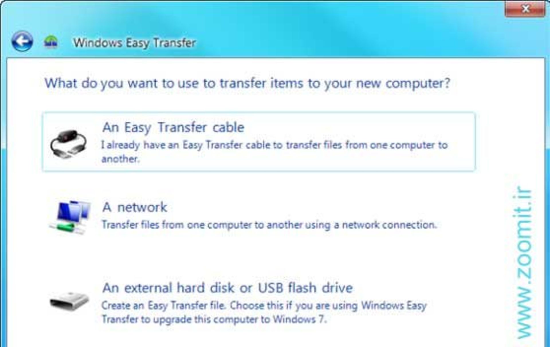 مایکروسافت همراه با ویندوز 7 ابزاری را ارائه کرده است که انتقال اطلاعات از سیستم عامل قدیمی به جدید را برای ما بسیار ساده کرده است، نام این ابزار Windows Easy Transfer می باشد. کار اصلی easy transfer تهیه یک نسخه از تمامی اطلاعات مورد نیاز کاربر است، پس از جمع آوری اطلاعات، کاربر براحتی و تنها با چند کلیک تمامی اطلاعات خود را به سیستم عامل جدید انتقال می دهد.
