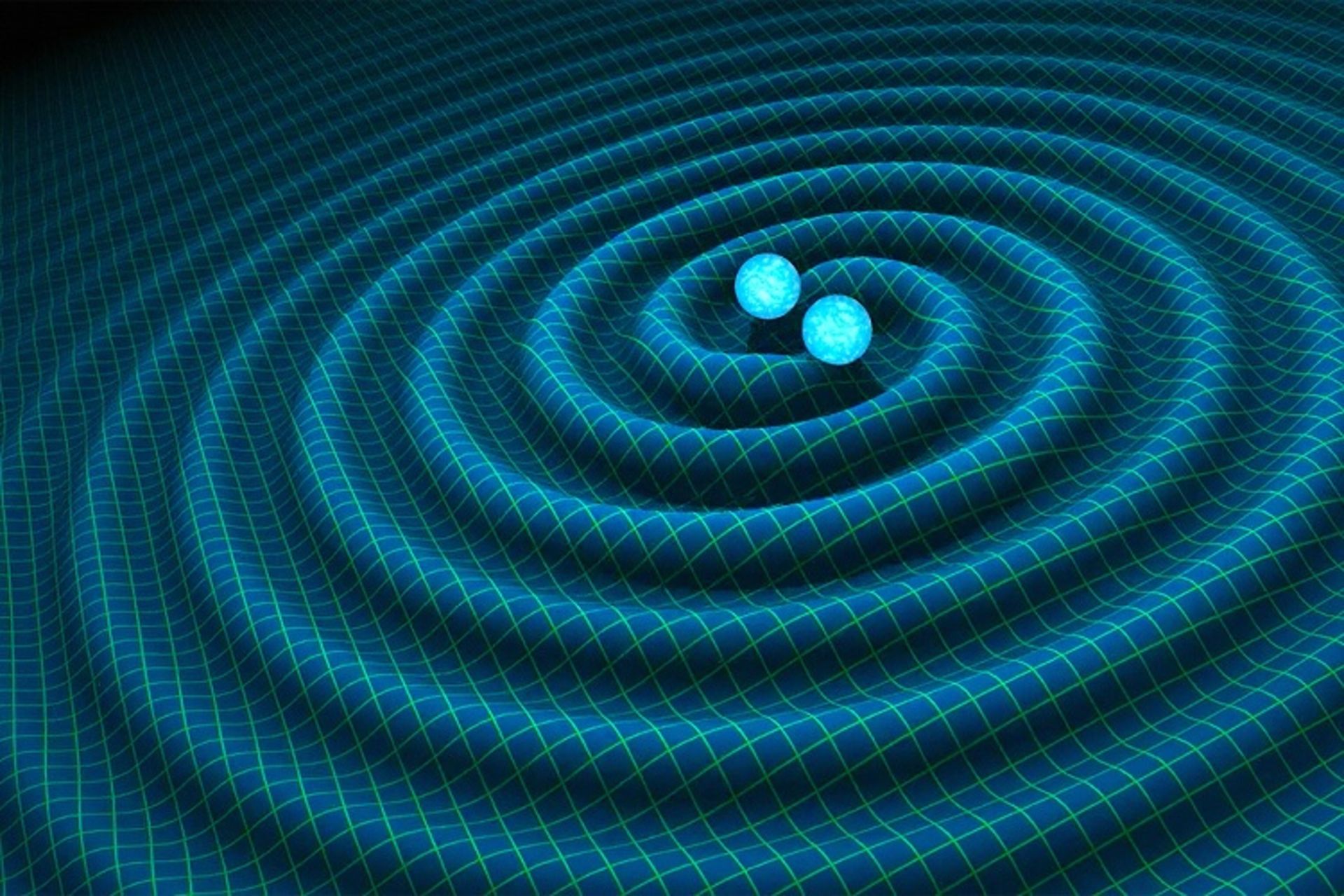 یک پالسار (تب اختر) که در حال دور زدن یک پالسار دیگر است و امواج گرانشی ایجاد شده (برآمدگی و فرورفتگی در فضا-زمان) در نتیجهی آن