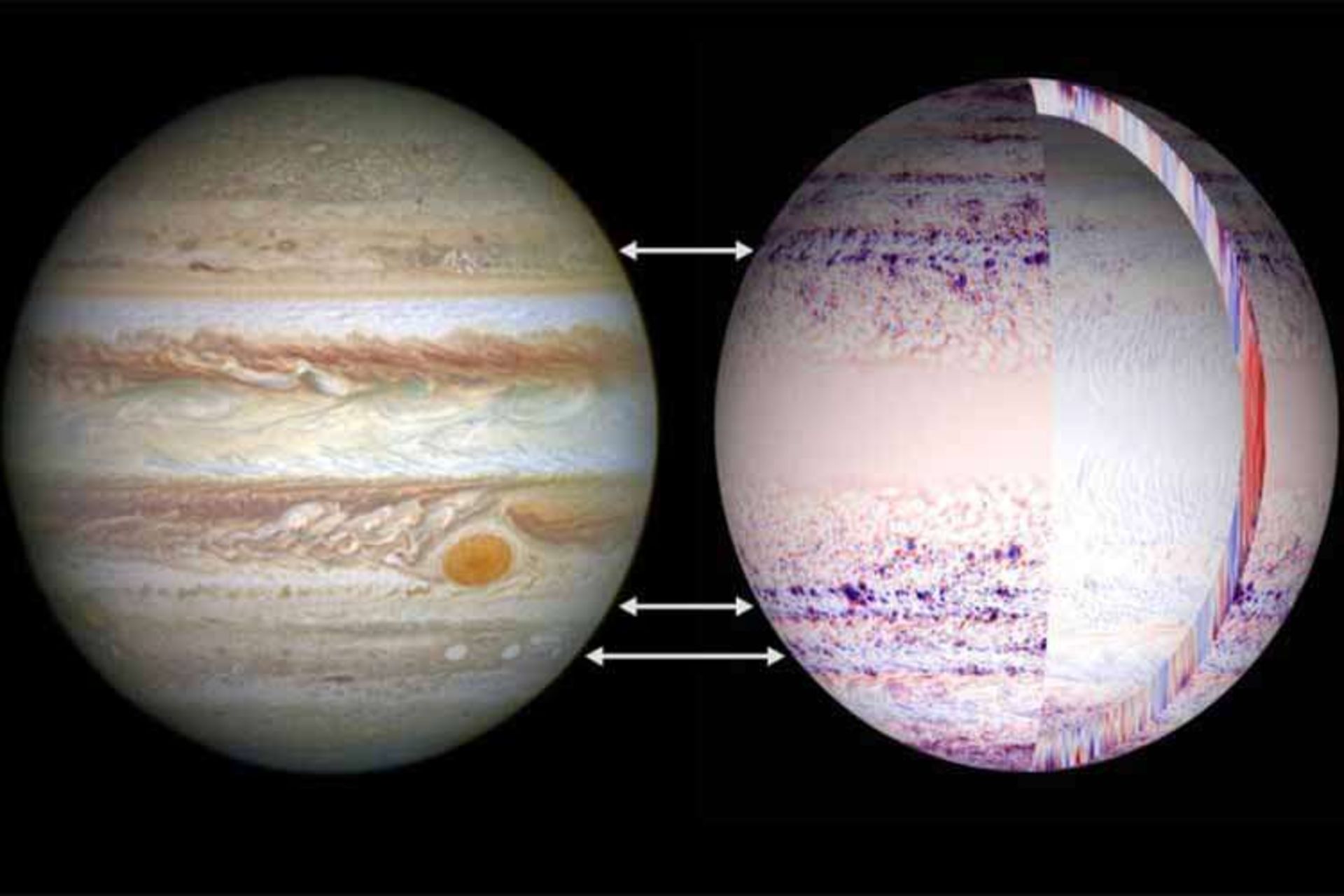 در تصویر بالا در سمت چپ سیارهی مشتری و درسمت راست جریان عمیق اتمسفری شبیهسازیشده از این سیاره را میبینید. تصویر اصلی در واقع تصویری است که تلسکوپ فضایی هابل از مشتری گرفته است.
