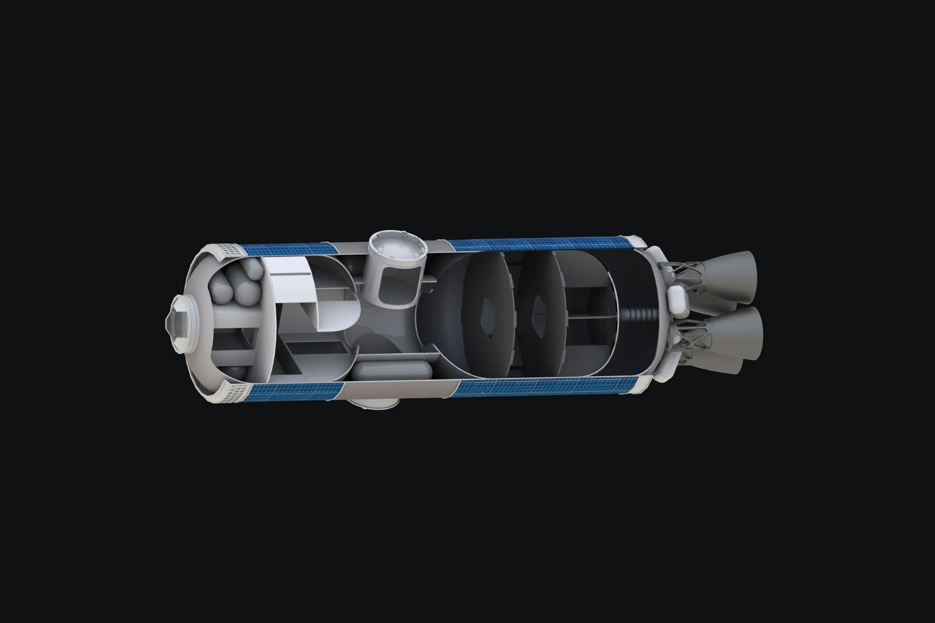 تصویر رندر یک ایستگاه فضایی نانورکس که از مرحلهی فوقانی موشکی مصرفشده ساخته شده است.