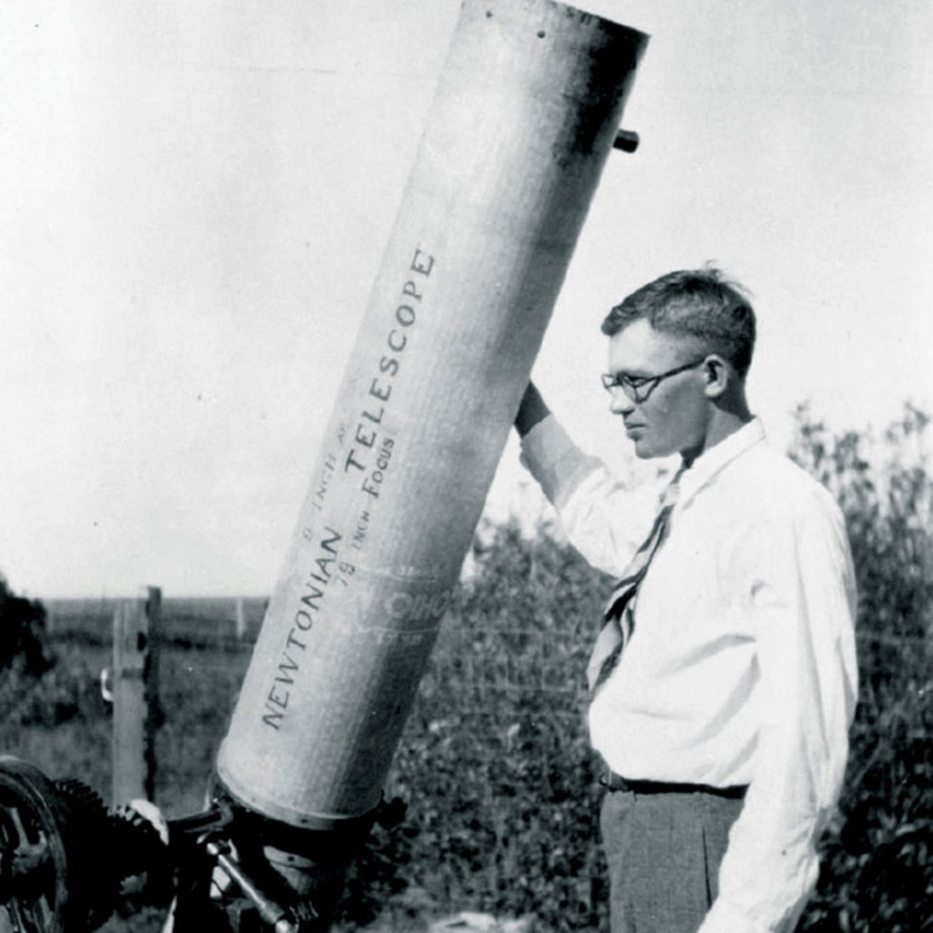 کلاید تومباگ با تلسکوپ خانگیاش. او پلوتو را در سال ۱۹۳۰ و ۲۴ سالگی کشف کرد