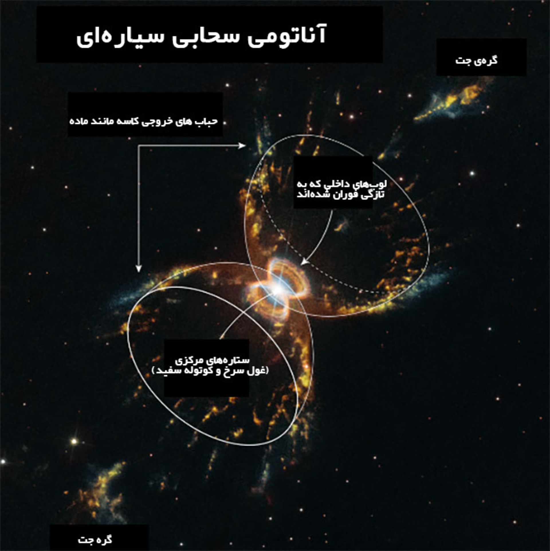 خورشید در پایان نمایش عظیم خود، لایههای گاز و غبار را به داخل فضا منتشر و پوششی از نور را ایجاد میکند که مانند علامتی نئونی به مدت هزاران سال میدرخشد و سپس ناپدید میشود. کهکشان پر از هزاران یادبود جواهرنشان مشابه است که با عنوان سحابی سیارهای شناخته میشوند. این سحابیها مراحل پایانی ستارههایی هستند که جرم آنها از نصف جرم خورشید تا هشت برابر جرم آن متغیر است (ستارههای سنگینتر دارای پایان پرتلاطمتری به نام سوپرنوا یا ابرنواختر هستند). سحابی سیارهای به انواع شکلها در میآید؛ از این سحابیها میتوان به سحابی خرچنگ جنوبی، چشم گربه و پروانه اشاره کرد؛ اما این سحابیها با وجود زیبایی مانند معمایی برای ستارهشناسها به نظر میرسند. چگونه پروانهای کیهانی از پیلهی به ظاهر سادهی غول سرخ به وجود میآید؟