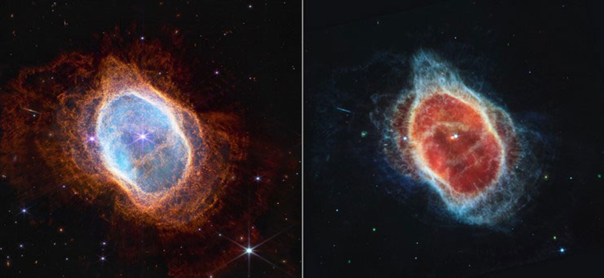 تلسکوپ فضایی جیمز وب ناسا، جزئیات خارقالعادهای را در سحابی حلقهی جنوبی نمایش میدهد. این سحابی سیارهای در فاصلهی ۲۵۰۰ سال نوری از زمین در صورت فلکی بادبان قرار دارد. در سمت چپ، تصویر فروسرخ نزدیک پوستههای هممرکز تماشایی گازی دیده میشود که تاریخچهی فورانهای ستارهی در حال مرگ را نمایش میدهند. در سمت راست، تصویر فروسرخ میانی بهراحتی ستارهی در حال مرگ را در مرکز سحابی (قرمز) از ستارهی همراه آن تفکیک میکند (آبی). کل گاز و غبار موجود در این سحابی از غول سرخ دفع شده است.