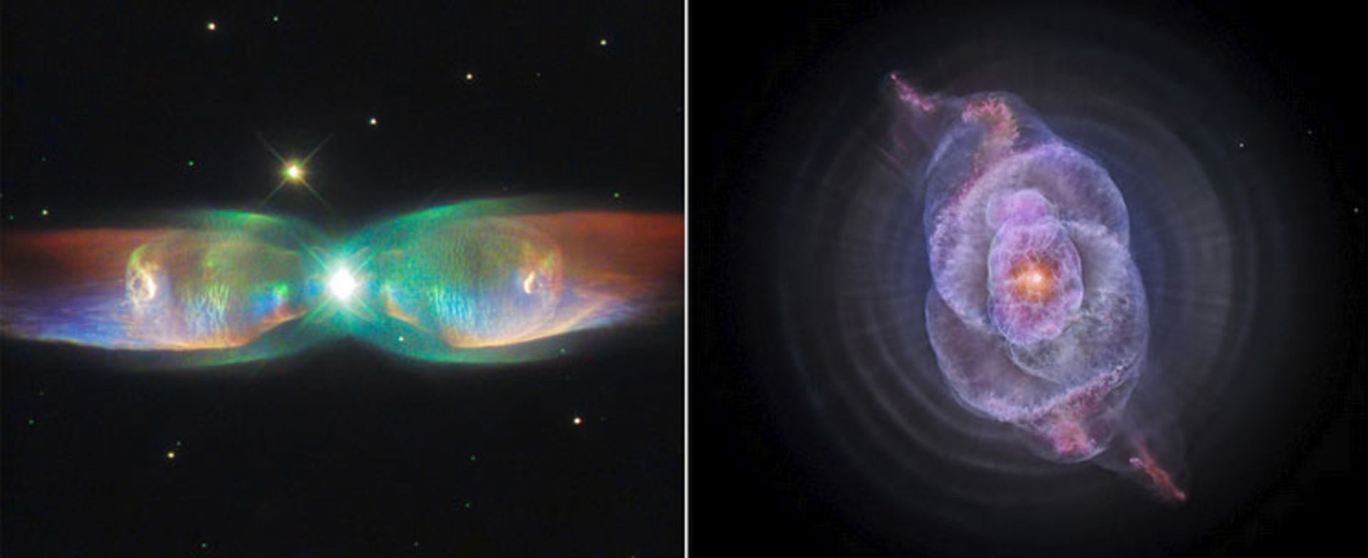 چپ: سحابی جت دوقلو، در فاصلهی ۲۴۰۰ سال نوری از زمین در صورت فلکی مارگیر به شکل ساعت شنی درآمده و دو جریان گازی سریع دارد که به سمت قطبها حرکت میکنند. این گاز احتمالاً در حدود ۱۲۰۰ سال پیش از ستارهای مرکزی منتشر شده است. راست: سحابی چشم گربه در فاصلهی ۳۳۰۰ سال نوری از زمین در صورت فلکی اژدها دارای ۱۱ حلقهی هممرکز غبار است که براساس تخمین ستارهشناسها در بازهای ۱۵۰۰ ساله به وجود آمدهاند. نوع فرایند که در آن ساختار داخلی پیچیده شکل میگیرد هنوز در حد حدس و گمان است. به نقل از آدام فرانک از دانشگاه روچستر: چشم گربه بسیار عجیب است و نمیدانم چگونه آن را توصیف کنم.
