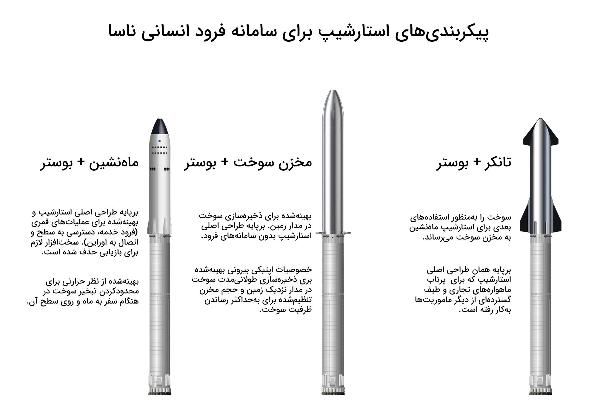 درهمینحال، قرارداد چندمیلیارد دلاری اسپیس ایکس برای استفاده از استارشیپ بهمنظور بازگرداندن فضانوردان ناسا به ماه، به نسخهای متفاوت از این موشک نیاز دارد که سوخت مورد نیاز را در مدار ذخیره میکند و توانایی بازگشت به زمین را ندارد. علاوهبراین، چند نسخهی اولیهی استارشیپ ماهنشین نیز ممکن است درعمل یکبارمصرف باشند و فقط برای فرود یک گروه از فضانوردان بهکار روند. بهطور خلاصه، اسپیسایکس درحالحاضر برنامههای گستردهای برای ساخت استارشیپهای مختلفی دارد که یا کاملا دورانداختنی هستند یا صرفا میتوانند در مدار دوباره استفاده شوند.