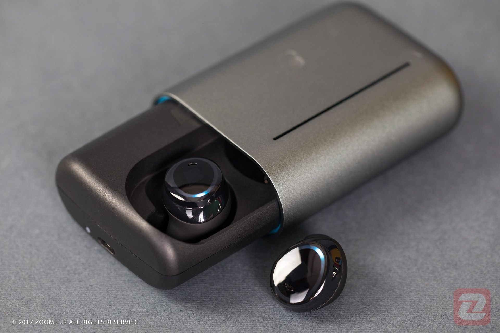 از همان ابتدا که جعبهی آبی و مشکی این هدفون را باز میکنید، متوجه میشوید با یک هدفون لوکس طرف هستید که کیفیت ساخت بالایی دارد. اولین نکتهای که پس از بازکردن جعبهی این هدفون نظر شما را جلب میکند، کیسی است که هدفون در آن قرار دارد؛ یک کیس آلومینیومی که لوگوی Bragi روی آن حک شده است و هدفون درون محفظهای قرار گرفته که بهصورت کشویی وارد این کیس آلومینیومی میشود. این کیس، علاوه بر اینکه میتواند از هدفون شما محافظت کند، نقش یک پاوربانک را نیز ایفا میکند و توانایی ۵ بار شارژ کامل هدفونها را دارد. برای شارژ کردن کیس و هدفون، کافی است از طریق کابل microUSB که درون جعبه موجود است (یا هر کابل microUSB دیگری)، کیس را به منبع تغذیه متصل کنید.