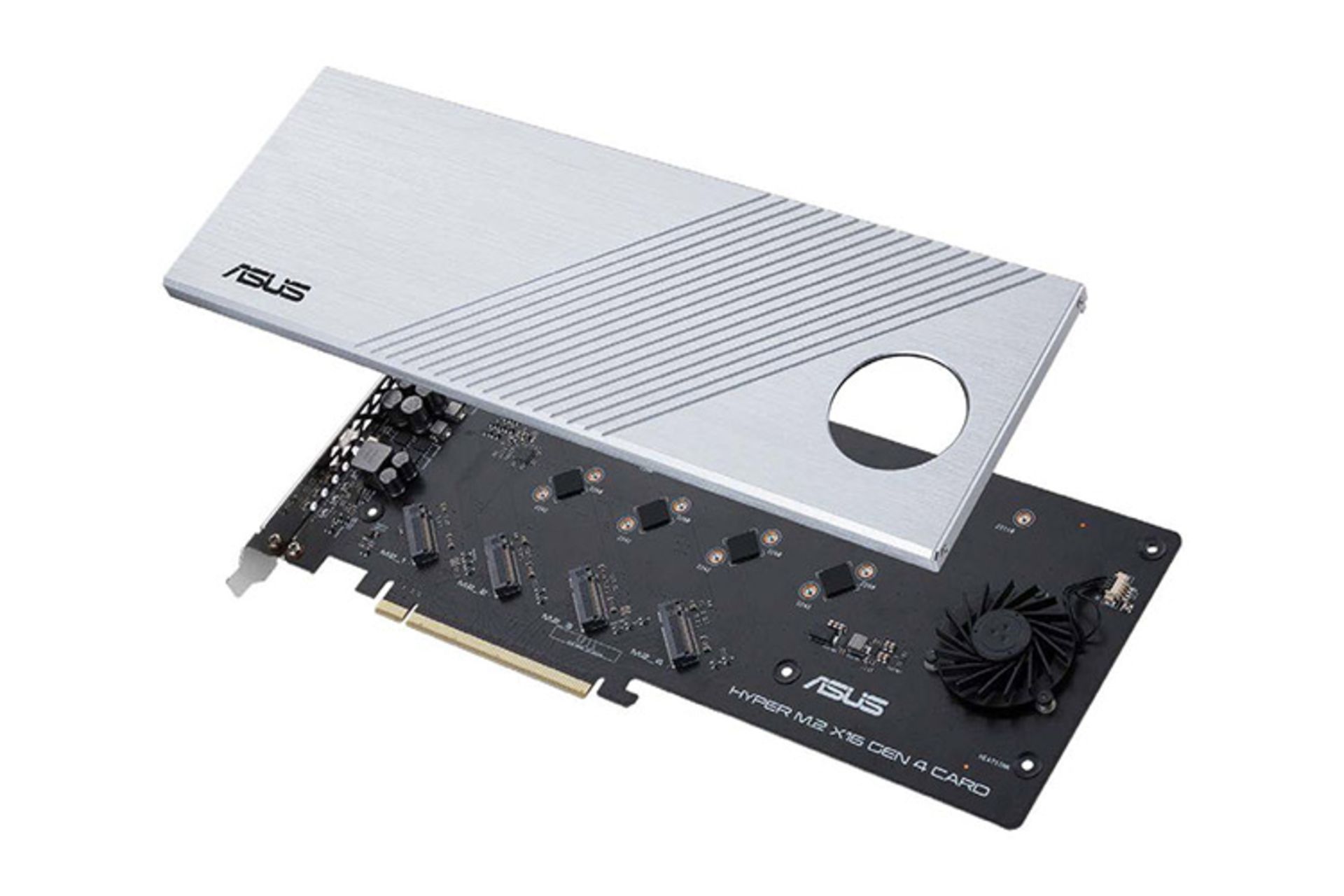 این محصول میتواند میزبان ۴ درایو SSD نوع M.2 باشد. در نهایت Hyper M.2 روی یک درگاه توسعه PCI-Express 4.0 x16 نصب شده و از آرایههای RAID نیز پشتیبانی میکند. ایسوس برای جلوگیری از بالارفتن دما در ماژولهای SSD، یک هیت سینک آلومینومی و یک فن را در Hyper M.2 مورد استفاده قرار میدهد. هر درایو از یک درگاه PCIe 4.0 x4 بهره میبرد که جمع آنها به یک درگاه کامل PCI-Express 4.0 x16 میرسد.