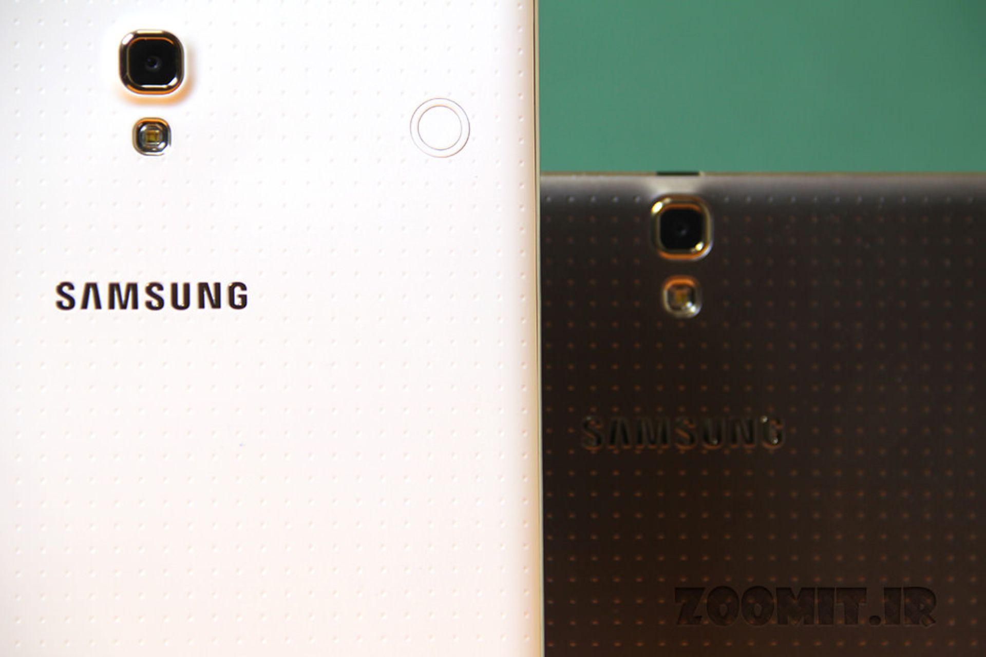 این حاشیه باریک نه تنها موجب جذابیت بیشتر محصول میشود بلکه باعث میشود تا تبلت به خوبی در دست جای گیرد. پوشش پشتی دستگاه نیز از همان طرح نقطه نقطه همانند اس ۵ بهره میبرد. سامسونگ این بار از پلاستیک نرم همیشگی خودش در ساخت گلکسی تب اسها استفاده نکرده و در عوض پلاستیک سخت و مقاومتری را در بدنهی این تبلتها بکار گرفته که نه تنها دوام و استحکام بیشتری در برابر ضربه و خط و خش دارد بلکه حس معروف کالاهای ارزان قیمت را به شما منتقل نمیکند. این یعنی شما با دست گرفتن تبلتهای تب اس، حسی را تجربه میکنید که تا به حال در هیچ کدام از تلفنها و تبلتهای گلکسی تجربه نکردید.