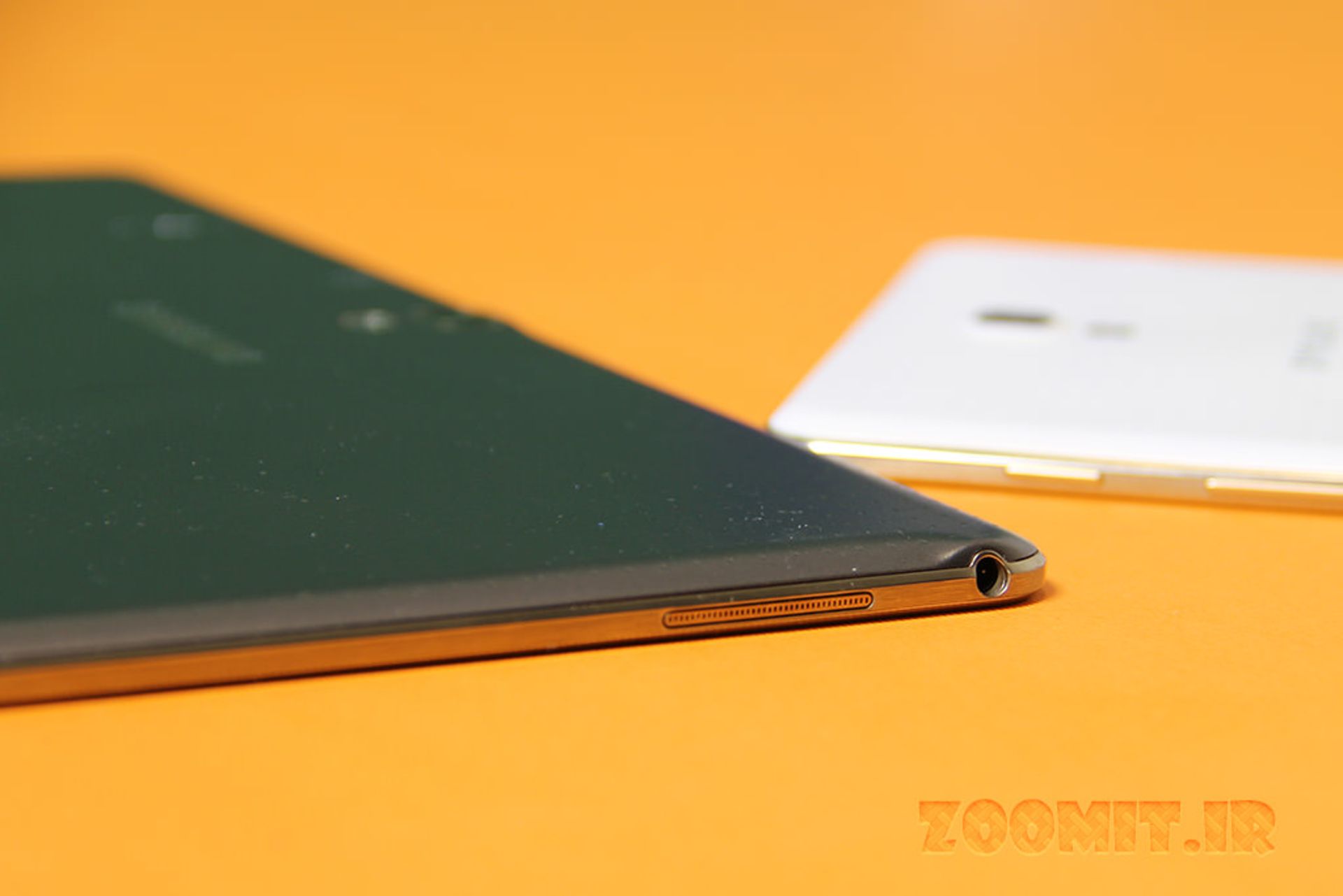 با وجود باریک بودن تبلت، اسپیکرها کیفیت خیلی خوب، و حجم صدای بالایی دارند. این صدا آنقدر قوی است که در موقع تماشای فیلم بتوان روی آن حساب باز کرد. صدای خروجی حتی وقتی روی حداکثر تنظیم میشود، باز هم کیفیتش را از دست نمیدهد.