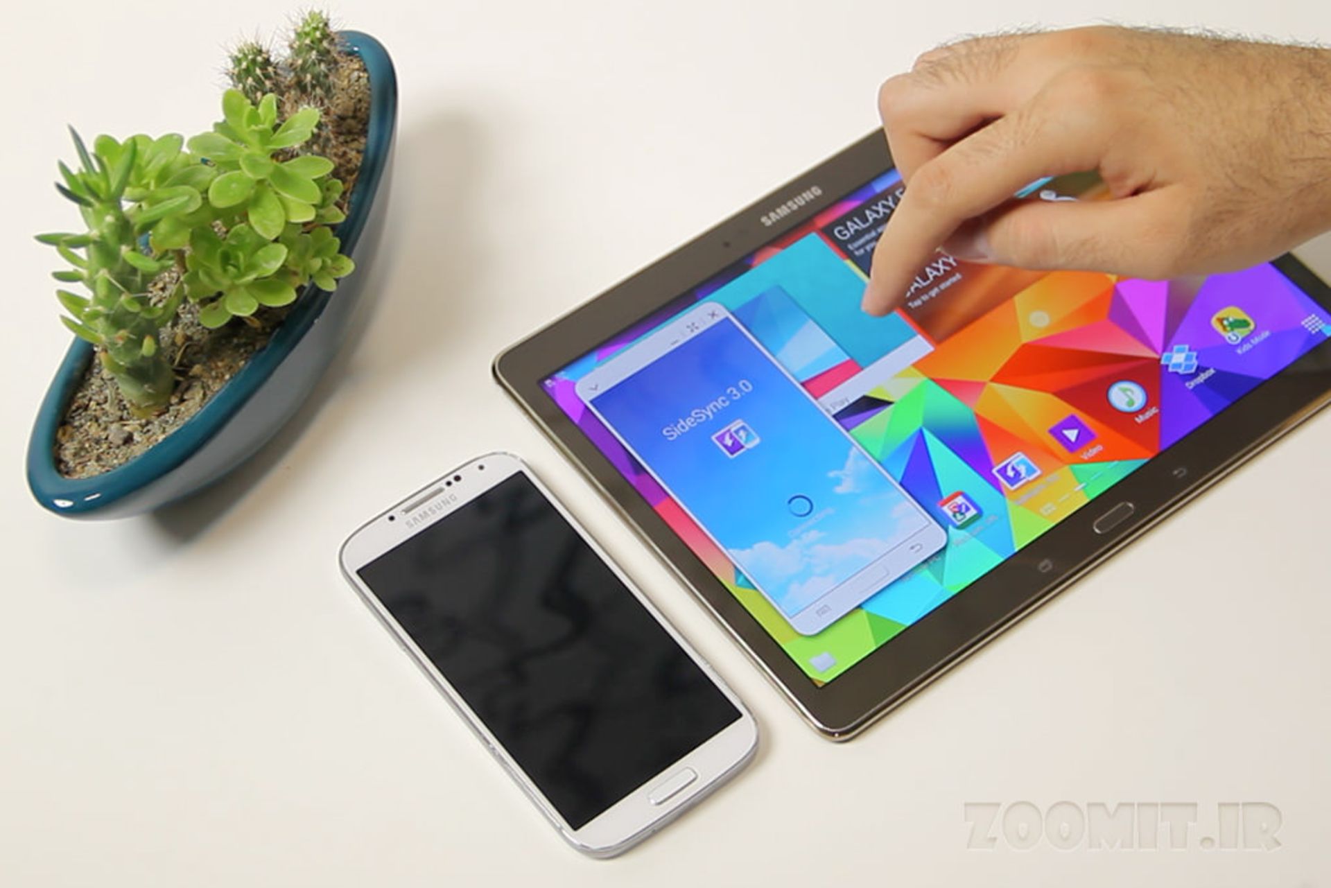 SideSync نرمافزار جالب دیگری است که از طریق آن میتوانید صفحه تلفن یا تبلت را در کامپیوتر مشاهده و کنترل کرد یا اینکه صفحه تلفن را در تبلت دید و هر کاری که در تلفن قصد انجام آن را داریم در تبلت انجام دهیم. فرض کنید که در حال کار با تبلت هستید و تلفن شما در یک اتاق دیگر از خانه، زنگ میخورد، از طریق این قابلیت میتوانید تماس تلفنی را از طریق تبلت جواب داد. از این قابلیت میتوان برای انتقال فایلها بین ابزارهای مختلف نیز بهره برد. البته سرعت انتقال تصویر از تلفن به تبلت با تاخیر روبر است که شاید با بروز رسانی نرمافزاری رفع شود. این قابلیت در بسیاری از ابزارهای سری گلکسی وجود دارد. ما این قابلیت را در گلکسی اس ۴ و گلکسی تب اسها آزمایش کردیم.