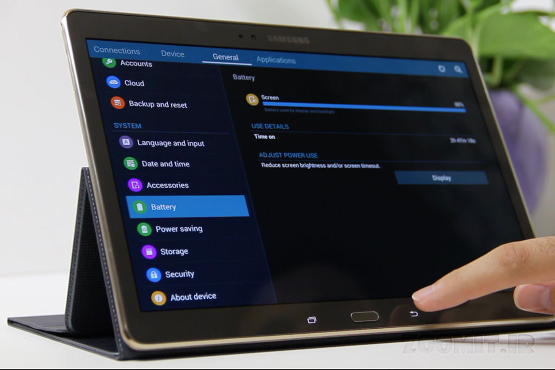گلکسی تب اس ۸.۴ اینچی به باتری ۴۹۰۰ میلی آمپر ساعتی و تب اس ۱۰.۵ اینچی به باتری ۷۹۰۰ میلیآمپر ساعتی مجهز شدهاند. در آزمایش پخش ویدیو این تبلتها ۱۰ ساعت و یکی دو دقیقه دوام آوردند که برای یک تبلت زمان خوبی محسوب میشود. این زمان نزدیک به دو ساعت بیشتر از طول عمر باتری اکسپریا زد ۲ تبلت سونی است. آیپد مینی و آیپد ایر هم در پخش ویدیو تقریبا ۱۰ ساعت دوام میآورند. البته در وب گردی این زمان به زیر ۹ ساعت کاهش پیدا میکند. با این حال طول عمر باتری با وجود باریک بودن تبلت بسیار خوب است و میتوان با یک بار شارژ، یک روز را بدون دردسر از آنها استفاده کرد.