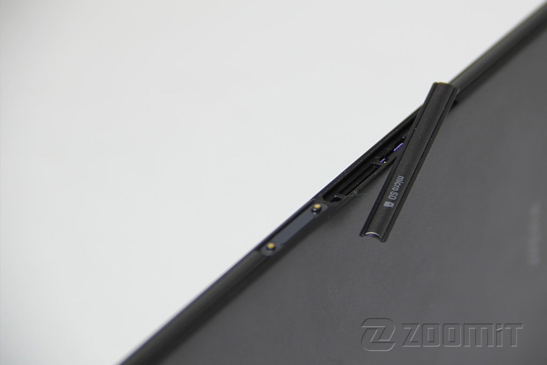 جایگاه جک هدفون در بخش بالایی به چشم میخورد، تبلت آنقدر باریک است که جک هدفون کمی بزرگتر از بدنهی دستگاه شده و برآمدگی میلیمتری را ایجاد کرده است. درگاه میکرو SD و نانو سیمکارت در لبهی چپ تبلت زد ۳ کامپکت حضور دارند و مطابق معمول درگاه میکرو USB در لبهی پایین این دستگاه ۸ اینچی جای خوش کرده است. تمام این درگاهها توسط روکشهای مخصوص سونی در برابر ورود آب محافظت میشوند که البته بیرون کشیدن آنها در شرایط معمولی کمی سخت میشود. بااینحال سونی این بار دقت بیشتری در طراحی این درپوشها کرده تا بدنهی دستگاه یکپارچهتر بهنظر برسد و درپوشها پیدا نباشند.