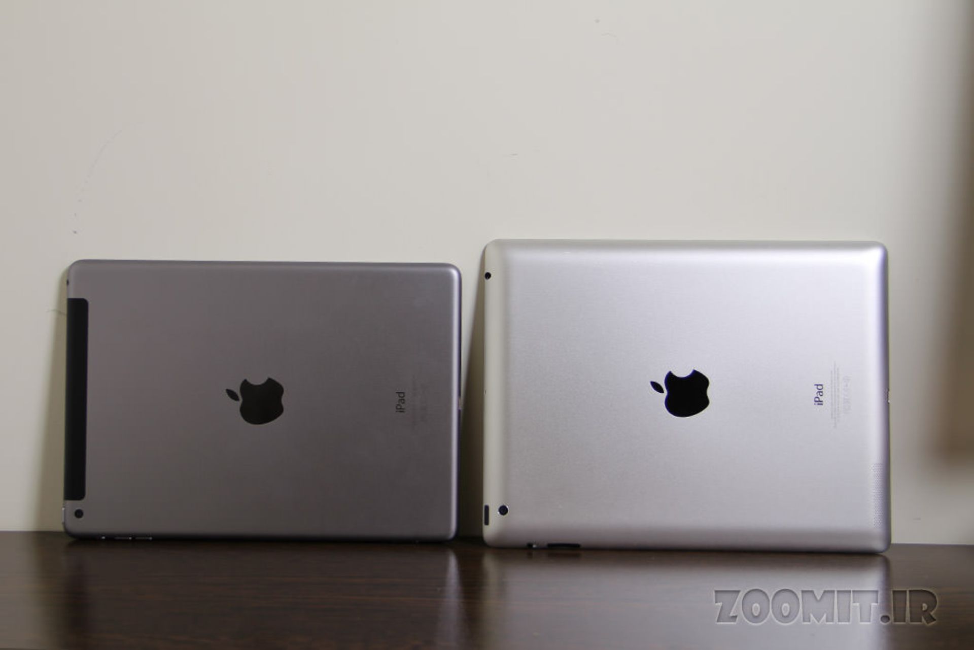 آیپد ایر دارای ابعاد ۲۴۰ در ۱۶۹.۵ در ۷.۵ میلیمتر است و این درحالی است که آیپد نسل سوم ابعاد ۲۴۱.۲ در ۱۸۵.۷ در ۹.۴ میلیمتری داشت. همچنین وزن آیپد ایر برابر ۴۶۹ گرم و وزن آیپد سوم ۶۵۲ گرم بود. به این ترتیب وزن آیپد ایر بیش از ۱۸۰ گرم و ضخامت آن نزدیک به ۲ میلیمتر کاهش یافته است و همه اینها باعث اروگونومی بهتر و استفاده آسانتر از آیپد ایر نسبت به آیپد اول میشود. اپل برای کاهش ابعاد و وزن دستگاه مجبور شده از باتری کوچکتری در آیپد ایر بهره ببرد و ظرفیت باتری را از ۱۱٫۵۶۰ میلیآمپر ساعت در آیپد نسل سوم به ۸٫۸۲۰ میلیآمپر ساعت در آیپد ایر کاهش داده است. بااینحال طول عمر باتری نسبت به نسل قبل تغییری محسوسی نکرده است و دلیل این موضوع نیز استفاده از نمایشگر کممصرفتر و پردازنده بسیار بهینه A7 است.