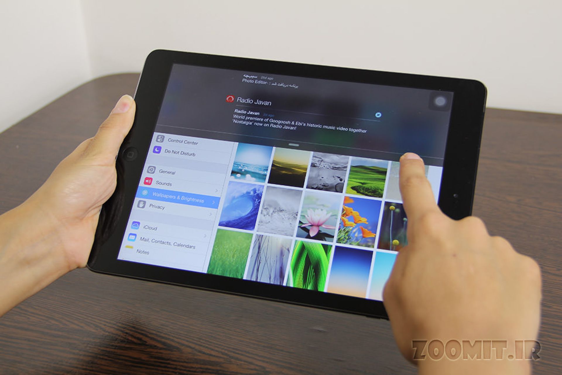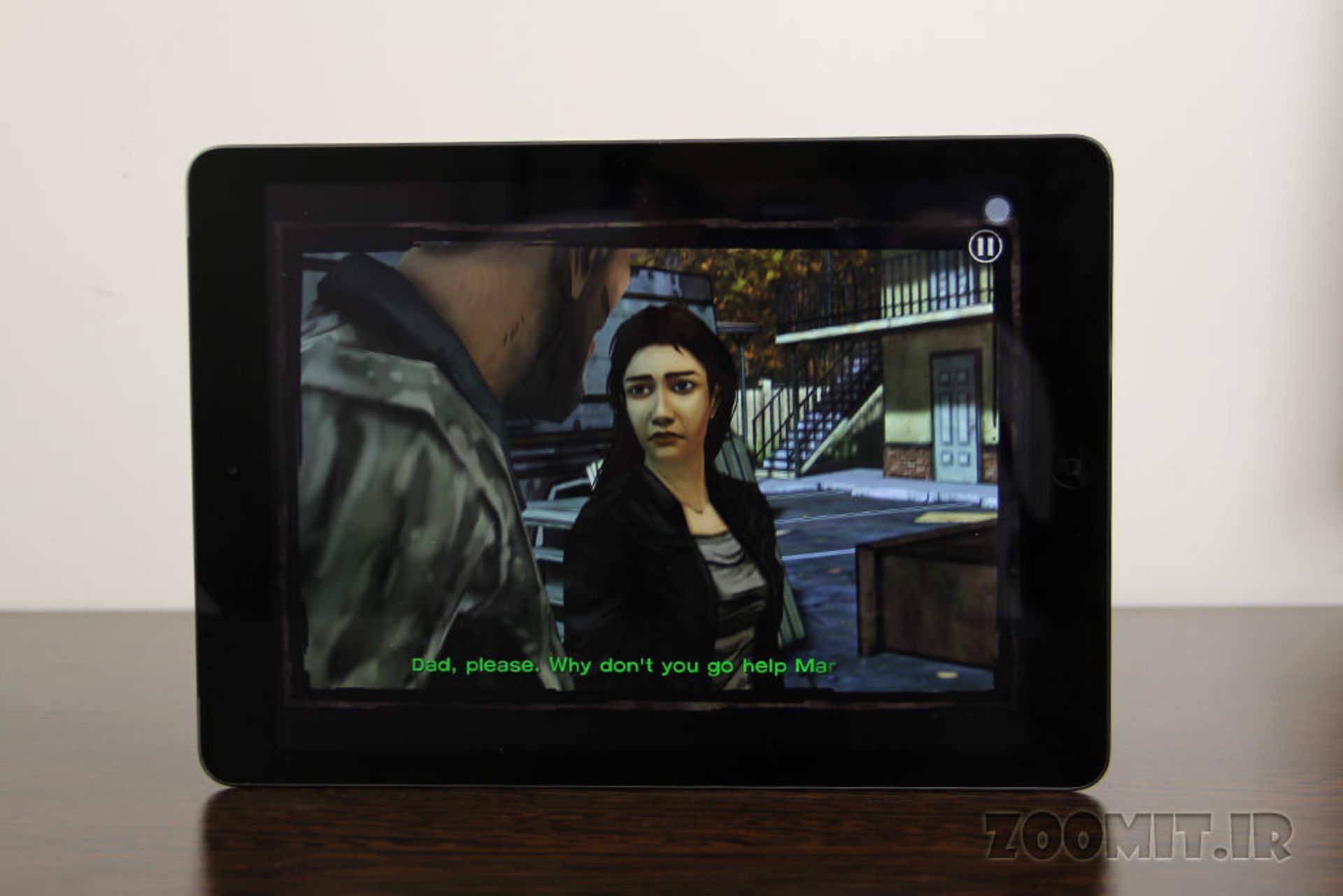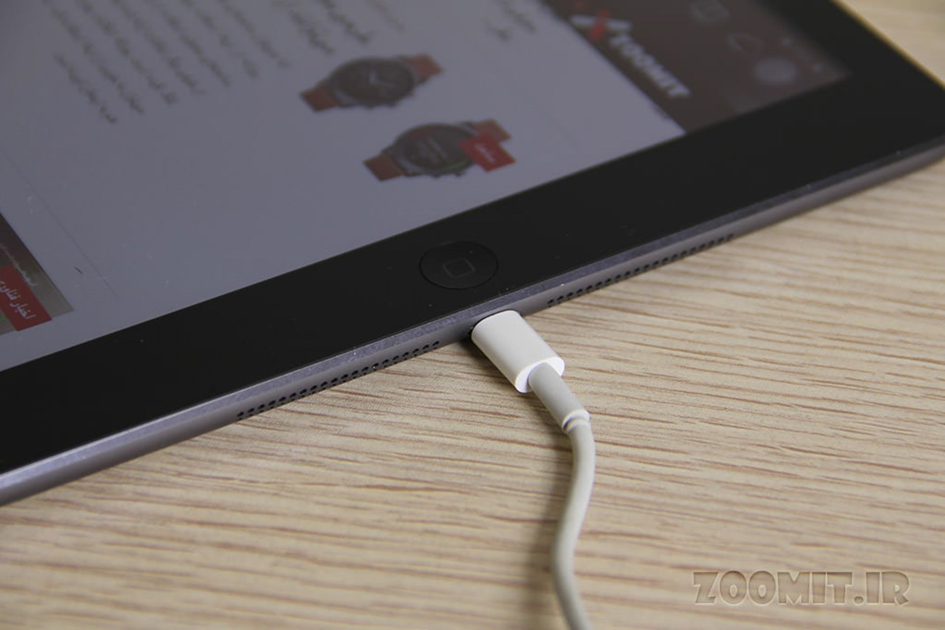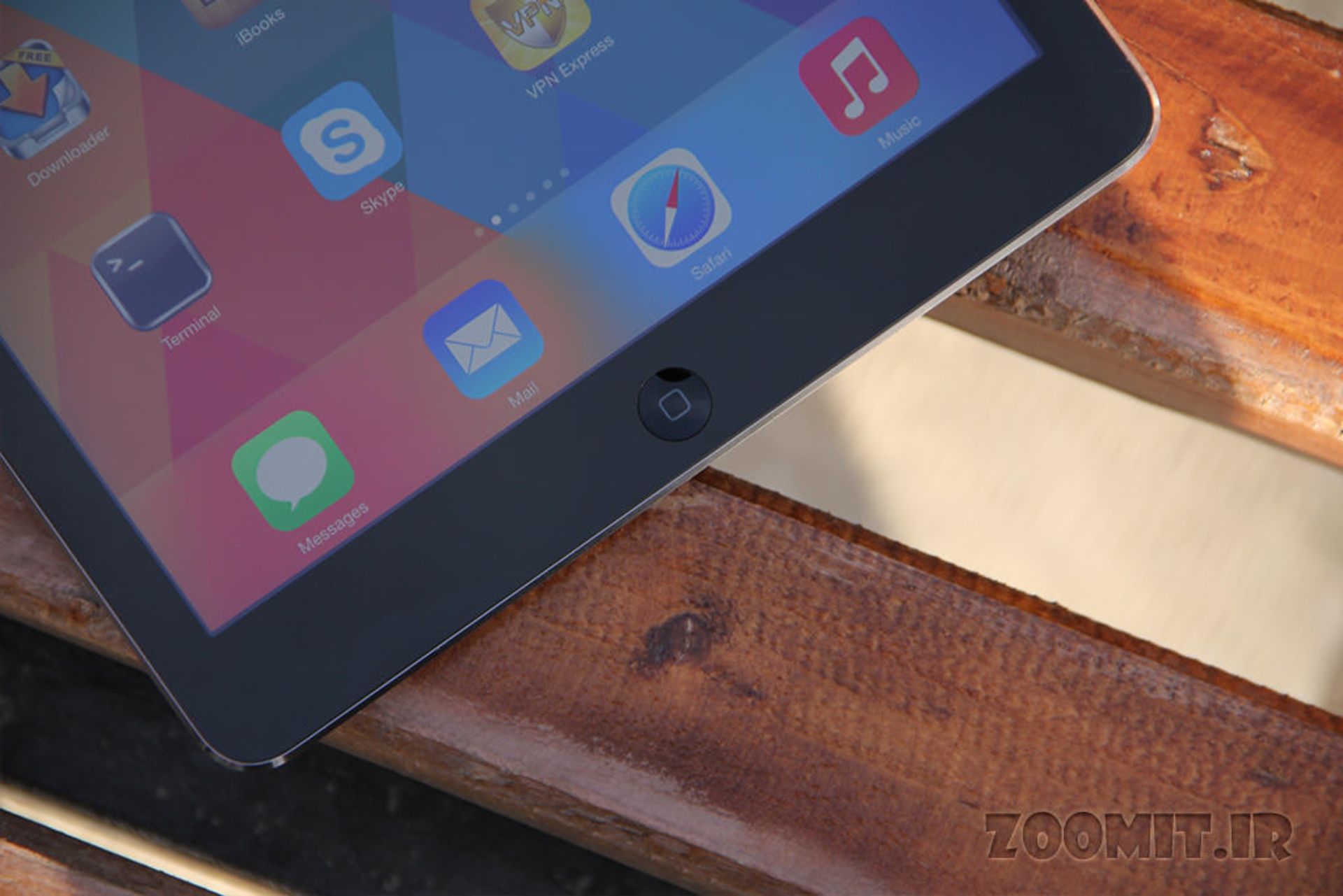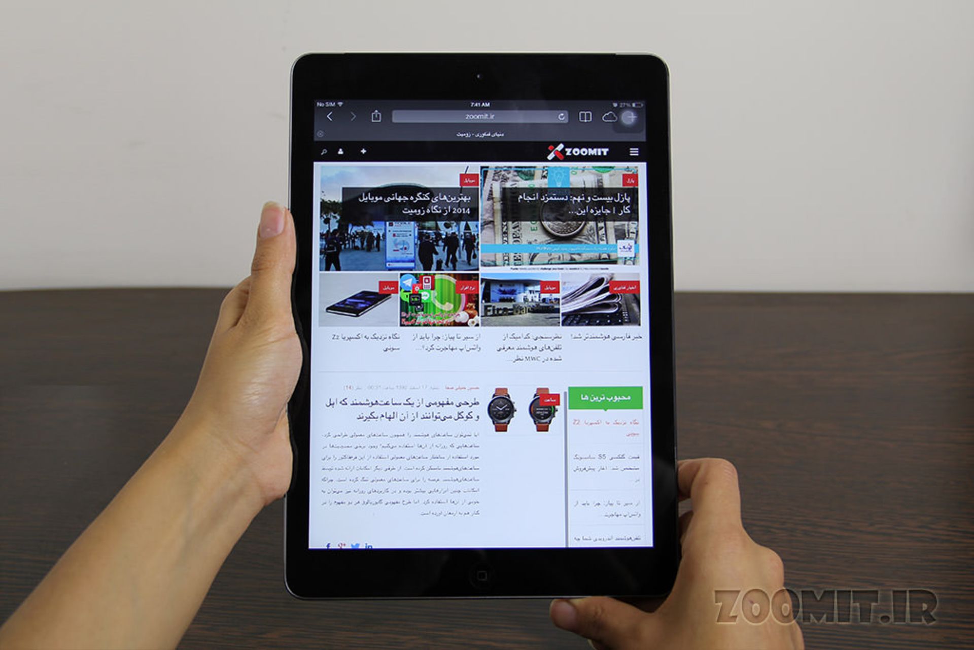 ما در آزمایش معمول زومیت، یک فیلم 720P را درحالیکه شبکههای ارتباطی خاموش شده بود و نور صفحه نیز روی 50 درصد تنظیم شده بود بهصورت مداوم پخش نمودیم و در این حالت باتری آیپد موفق شد تا 9.5 ساعت زیر این مصرف مداوم انرژی دوام بیاورد. در وبگردی با وای-فای یا شبکه 3G نیز پردازنده A7 بسیار بهینه عمل میکند و باتری دستگاه قادر است حدود 9 ساعت وبگردی را پشتیبانی کند.
