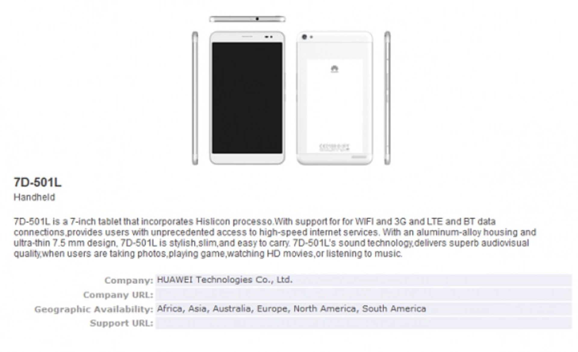 تبلت Huawei 7D-501L به منظور دریافت گواهی تجهیزات بیسیم در سایت Bluetooth SIG نمایان شد. این دستگاه یک تبلت هفت اینچی است که تا کنون توسط تولید کننده چینی Huawei معرفی نشده است.